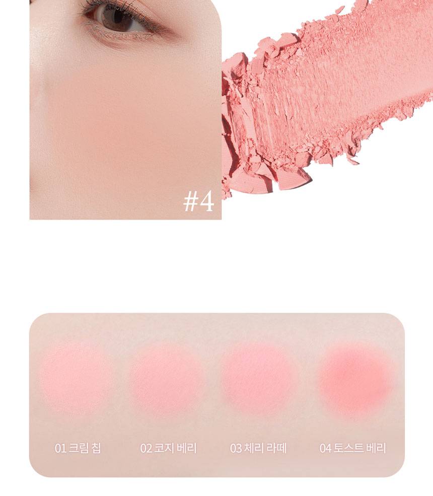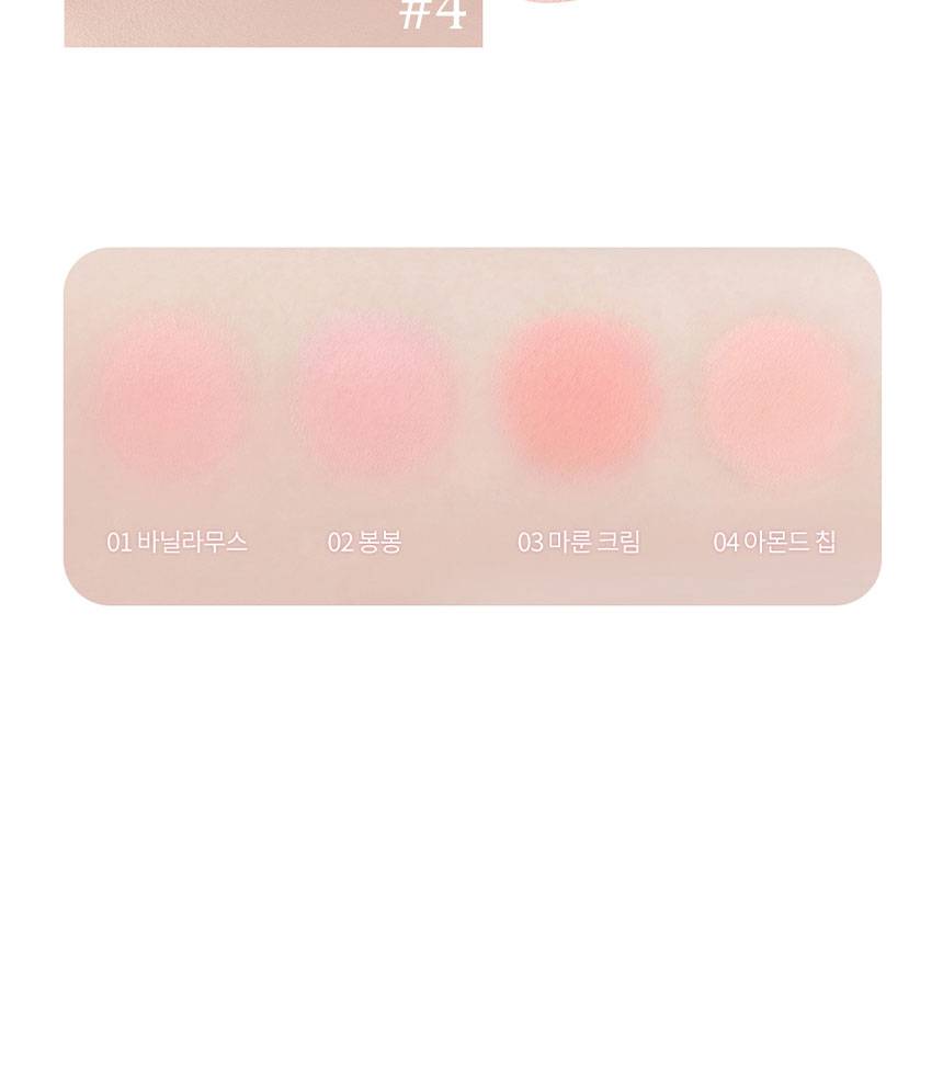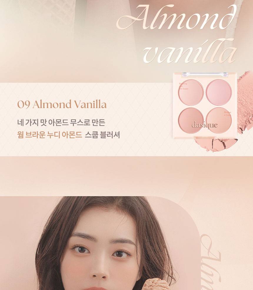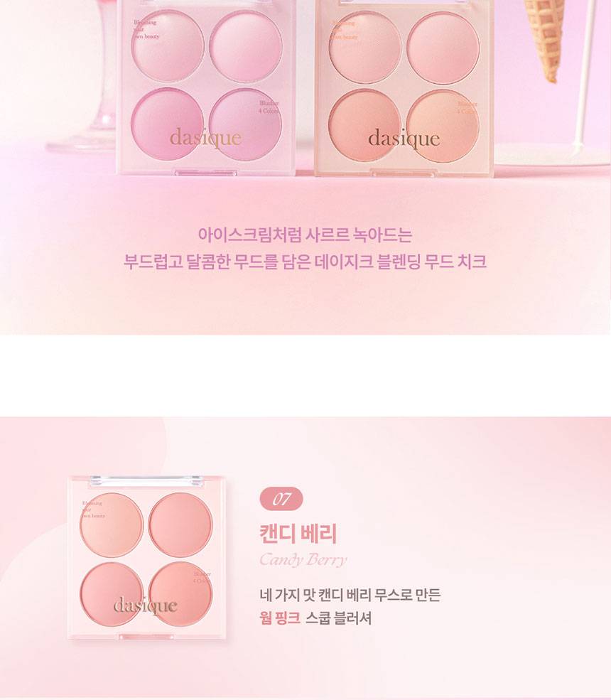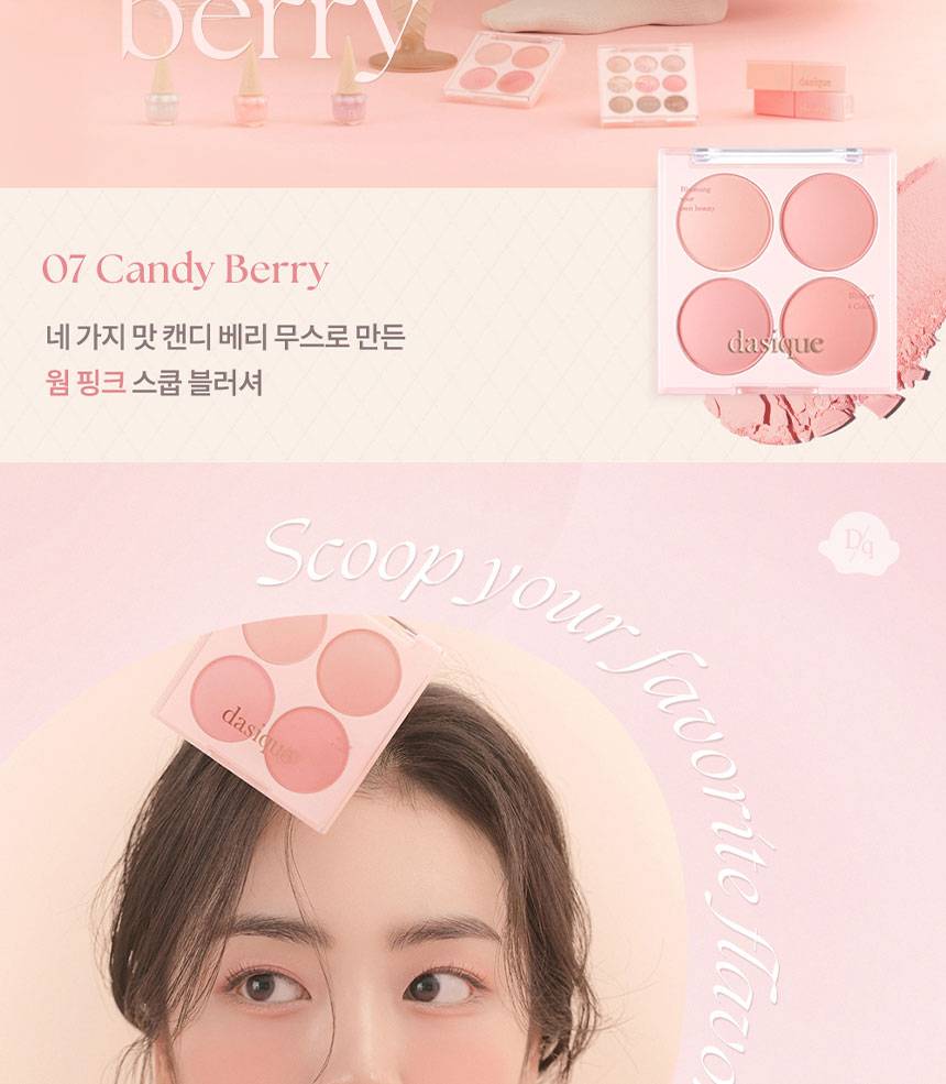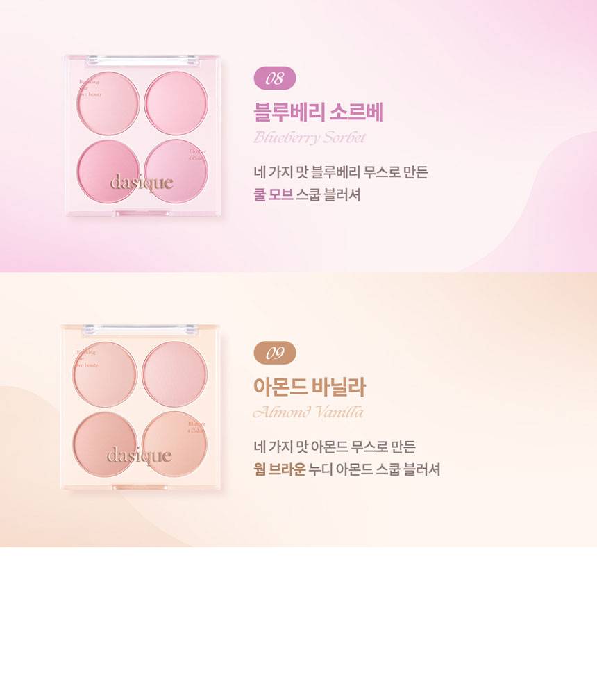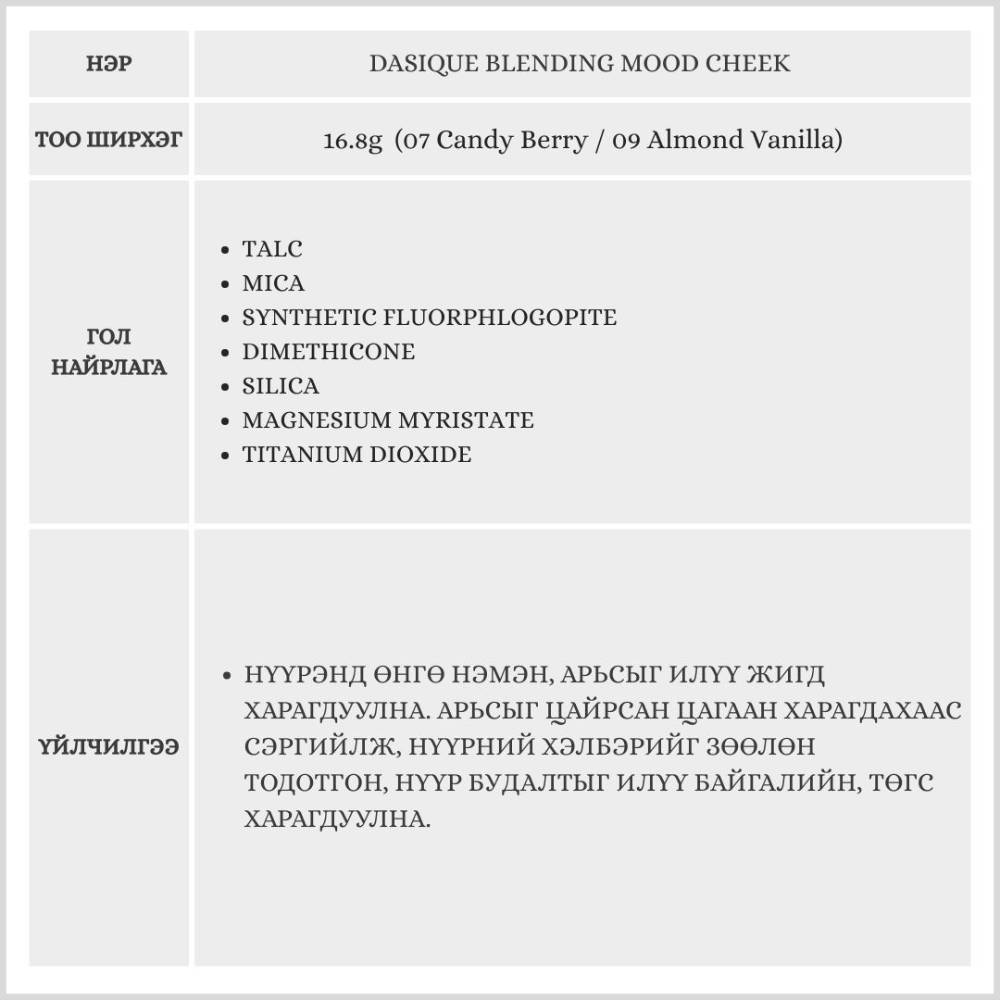 Dasique Blending Mood Cheek нь 4 өнгөтэй бөгөөд арьсанд бөөгнөрөхгүй, жигд, зөөлөн түрхэгдэж нүүрэнд өнгө нэмнэ. 07 Candy Berry нь жимслэг, тод өнгөтэй бол, 09 Almond Vanilla нь зөөлөн, дулаан төрлийн өнгөнүүдтэй тул өдөр тутмын болон гоёлын будалтанд аль алинд нь тохиромжтой.
