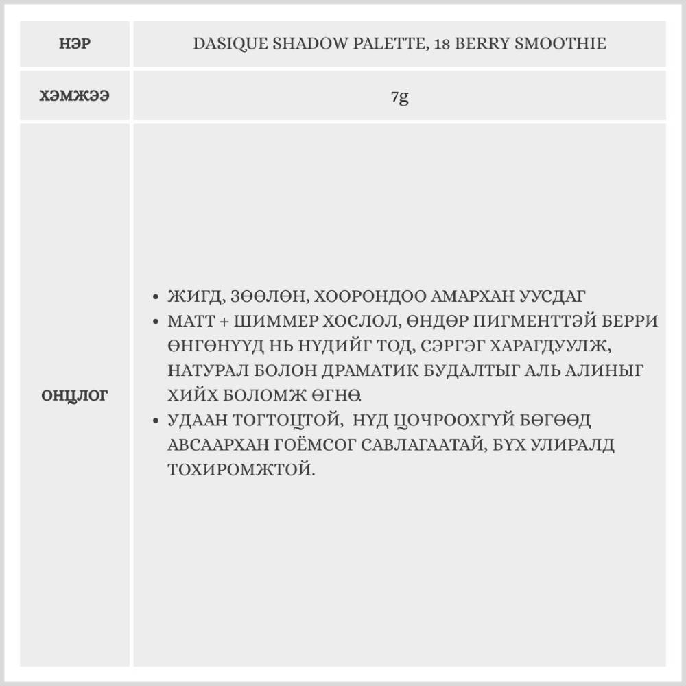 Жимсний зөөлөн ягаан өнгөнүүдээс бүрдсэн бөгөөд нүдэнд дулаан, эмэгтэйлэг зөөлөн төрхийг тодотгоно. Торгомсог, нарийн ширхэгтэй бүтэц нь арьсанд жигд уусан, бөөгнөрөхгүй тул будалт хийж эхэлж буй хүмүүс ч хэрэглэхэд тохиромжтой.