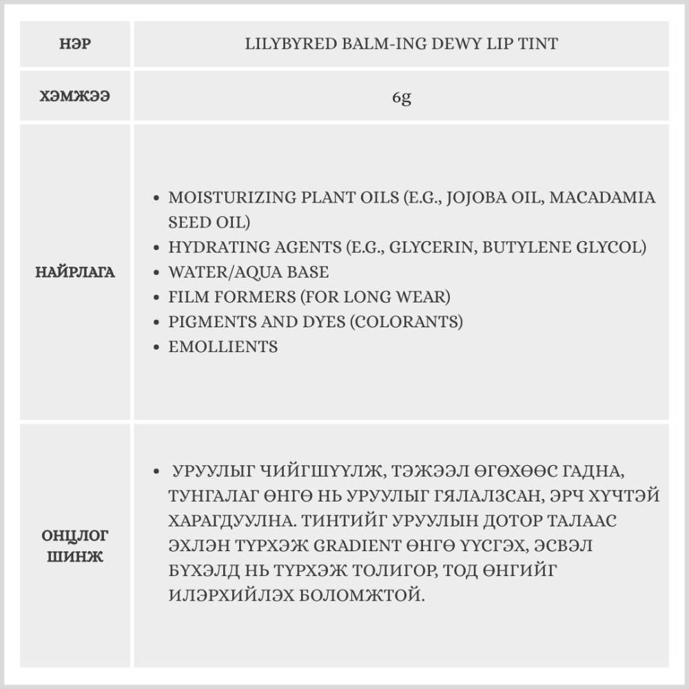 Уруулыг гүн чийгшүүлж, өнгө оруулж, гялалзсан харагдуулах үйлчилгээтэй удаан тогтоцтой өнгөт тинт. Усанд ууссан мэт хөнгөн, наалдамхай бус бүтэцтэй тул уруулыг тод, толигор, чийглэг харагдуулна.