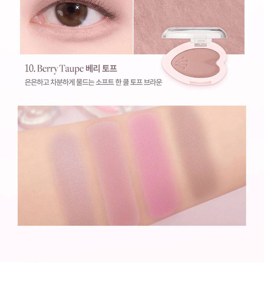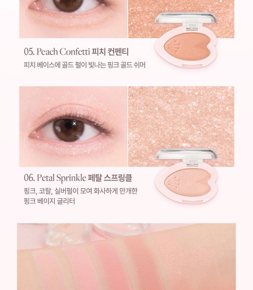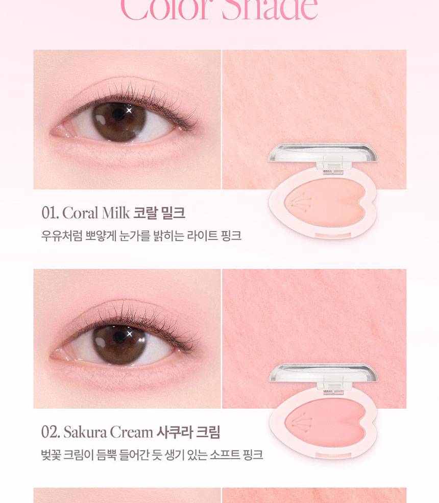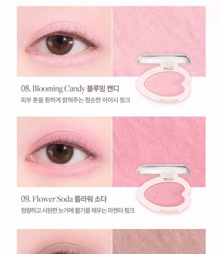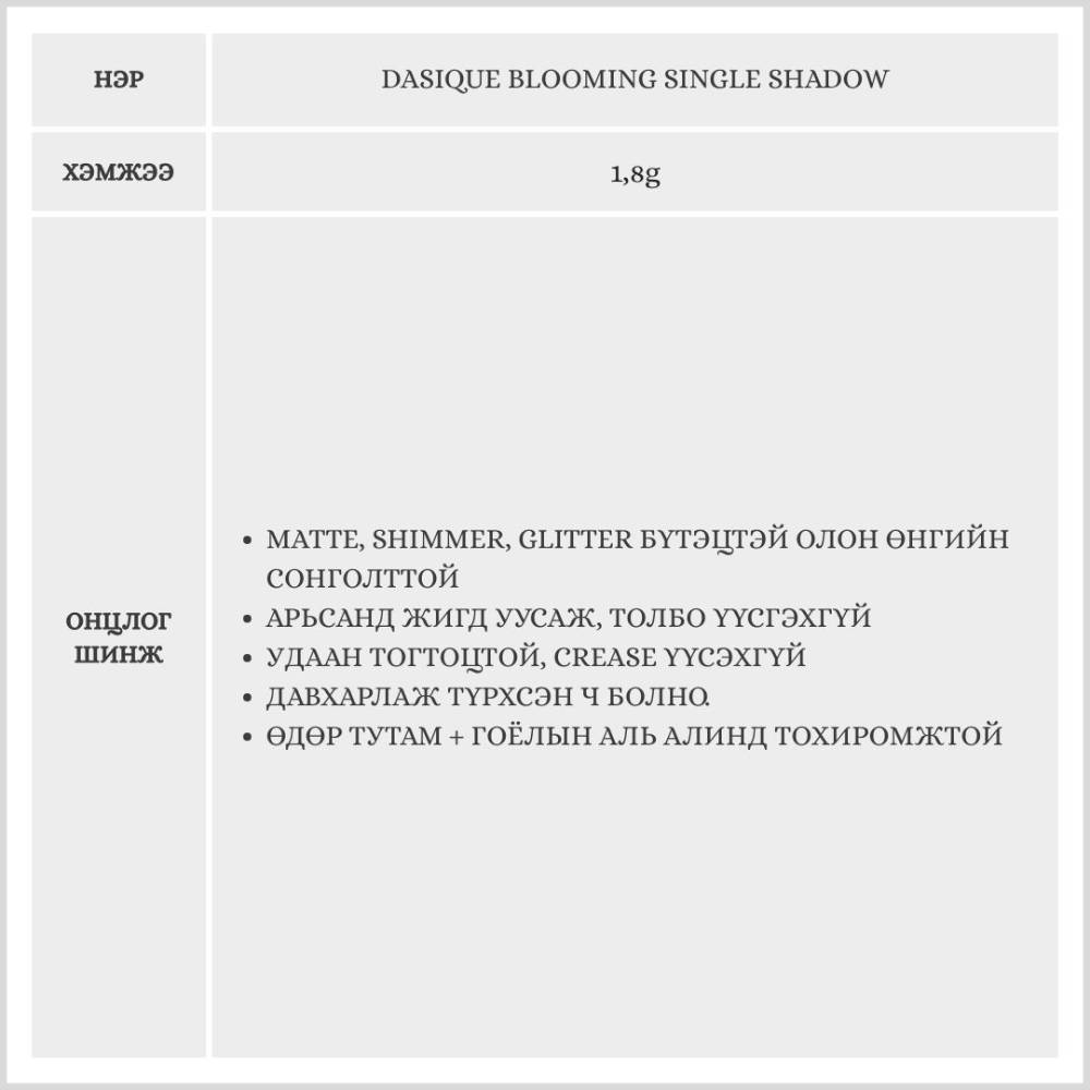 Нүдний будалтад цэцэг мэт зөөлөн өнгө нэмэх зориулалттай. Matte, Shimmer, Glitter зэрэг олон төрлийн бүтэцтэй тул бусад тениудтай хослуулан давхарлах эсвэл ганцаар нь өдөр тутмын хөнгөн, цэвэрхэн будалт хийхэд тохиромжтой.