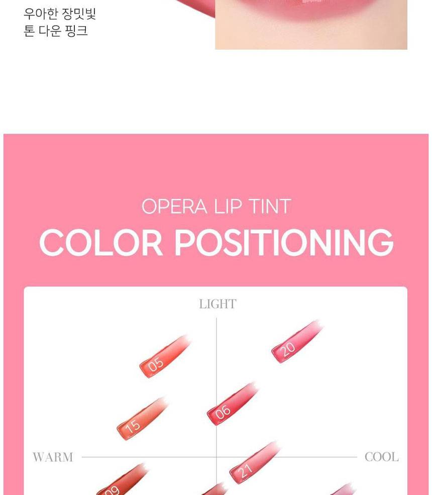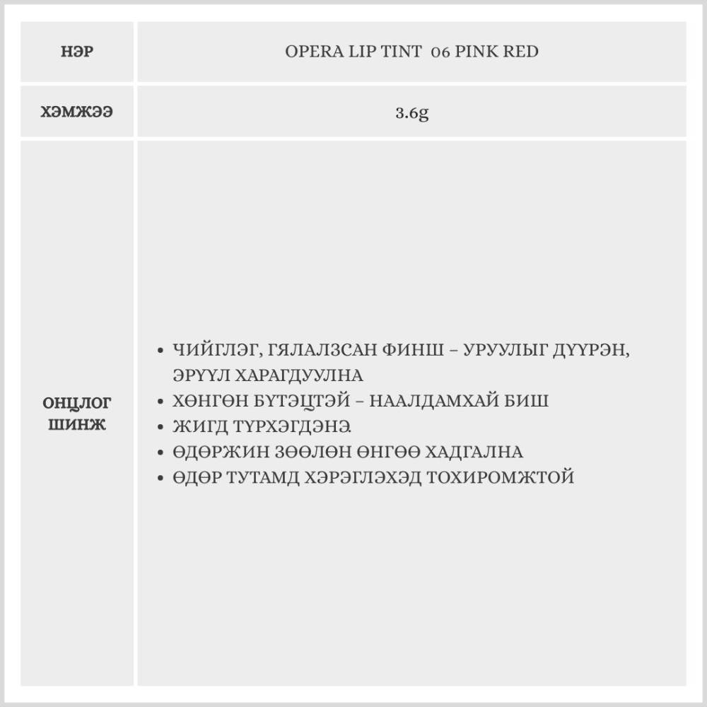 Opera Lip Tint нь Японы алдартай уруулын тинт бөгөөд, урууланд гялалзсан, тунгалаг (Sheer and Luminous) өнгө оруулах бүтээгдэхүүн юм. Уруулыг чийгшүүлж, гялалзсан болгох ба oil-based бүтэцтэй тул урууланд зөөлөн түрхэгдэнэ.