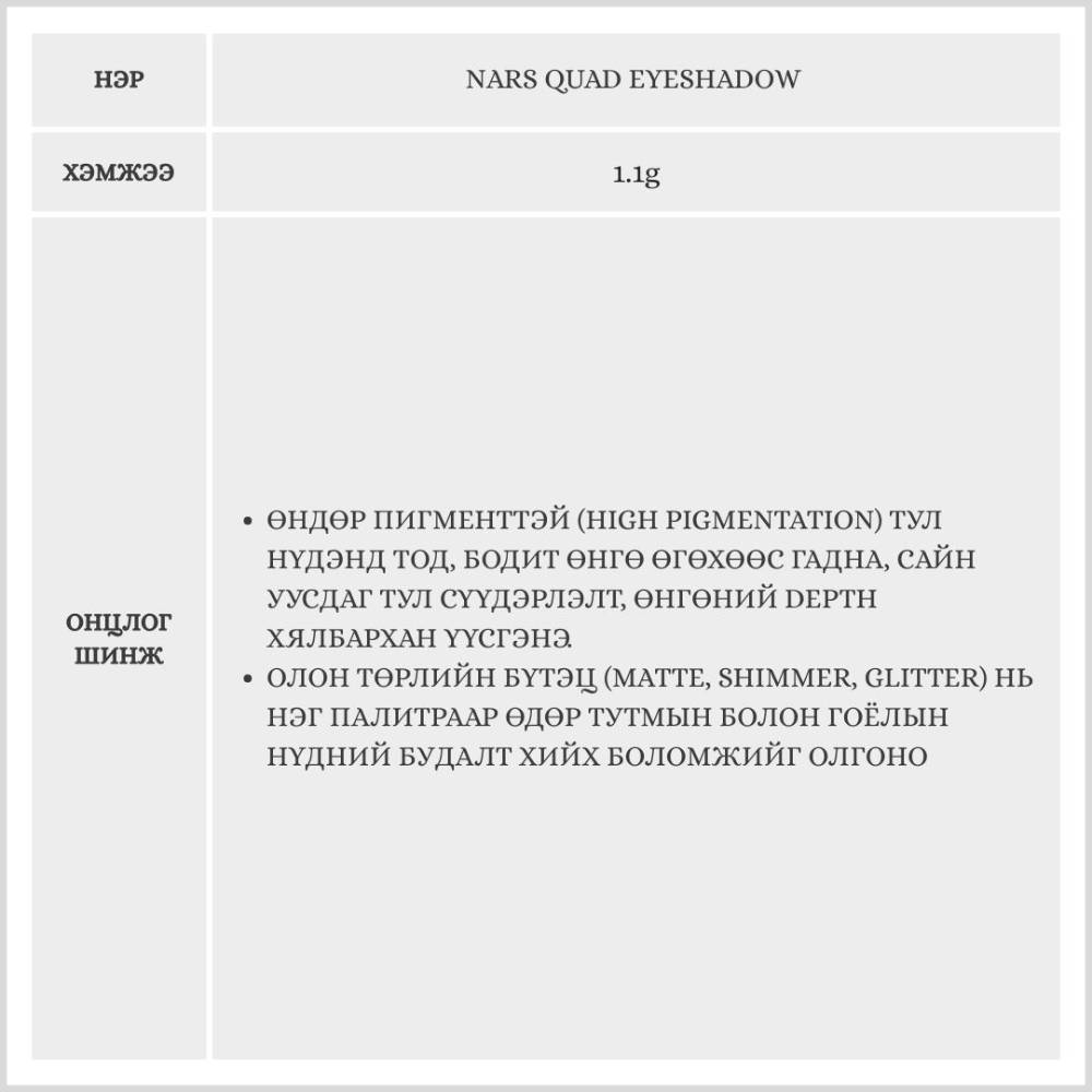 Өндөр пигменттэй, удаан тогтоцтой бүтэцтэй бөгөөд, Matte, Shimmer, Satin, Glitter зэрэг олон төрлийн өнгөнүүдийг хослуулснаар алдартай бүтэгдэхүүн юм. Таны нүдийг илүү эрч хүчтэй, цовоо сэргэлэн харагдуулна.