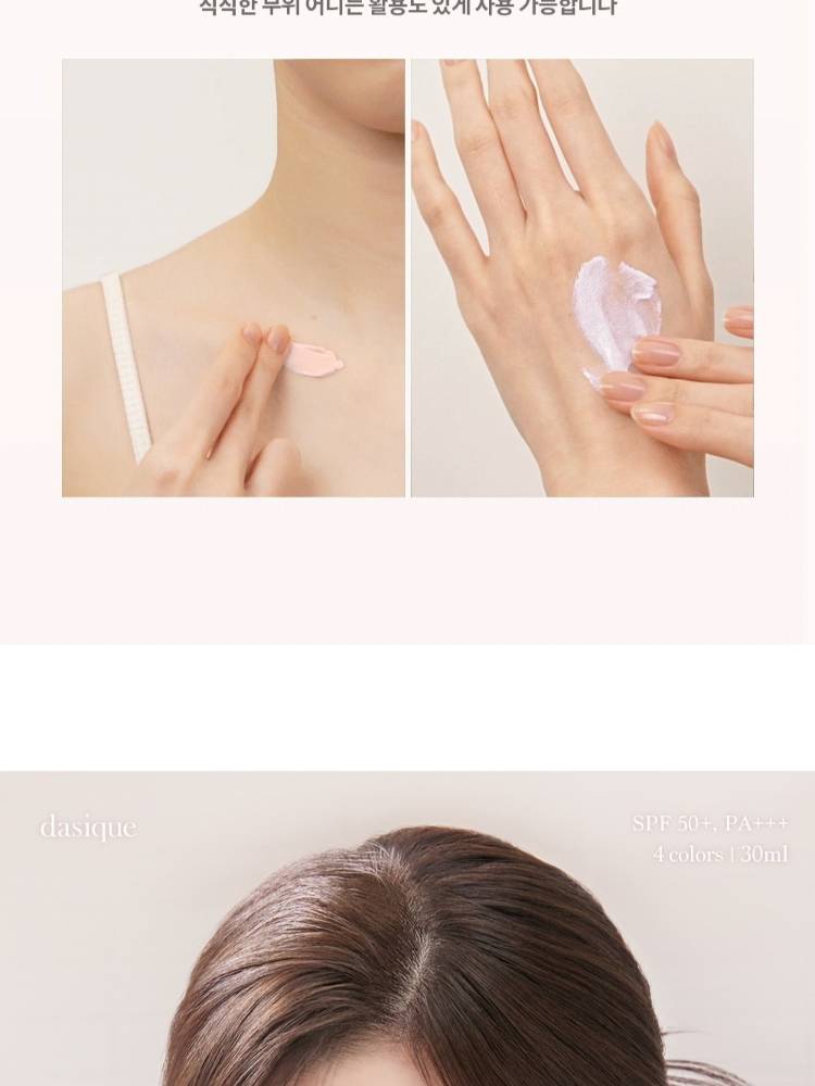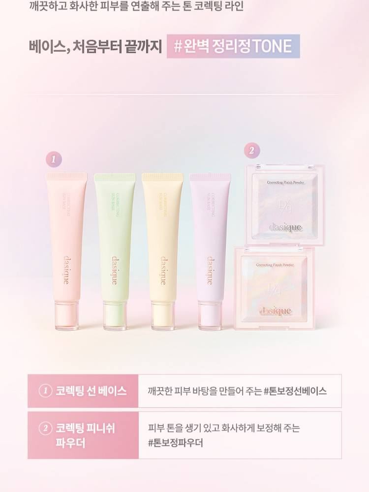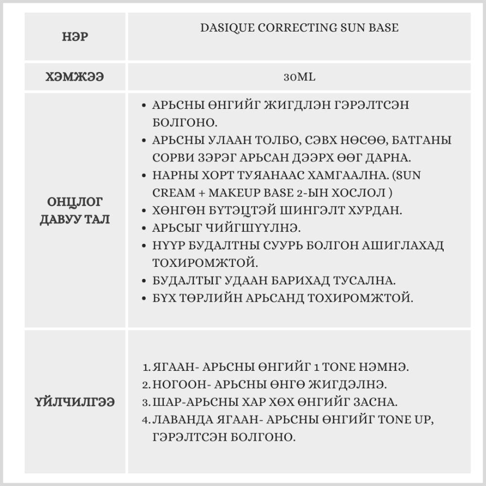 Dasique Correcting Sun Base бүтээгдэхүүн нь арьсны өө сэвийг дарж, өнгийг жигдэлж гэрэлтсэн болгох үйлчилгээтэй бөгөөд будалтыг тогтцыг уртасгана. Олон өнгөний сонголттой.