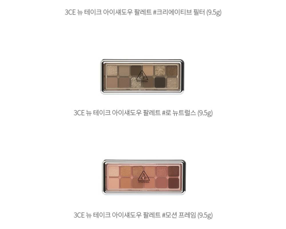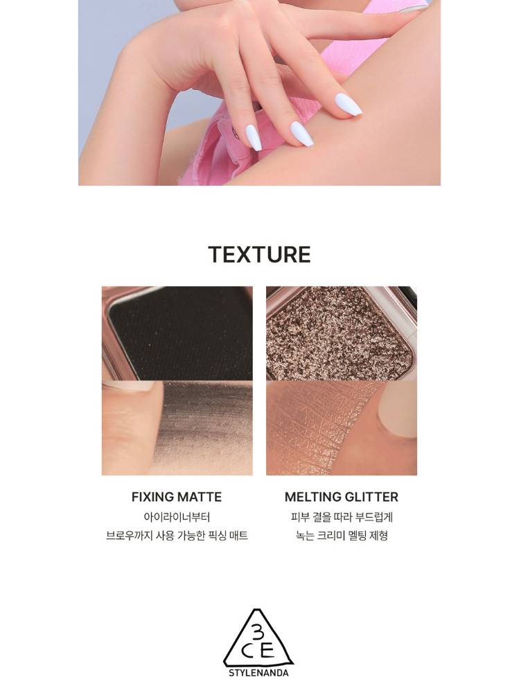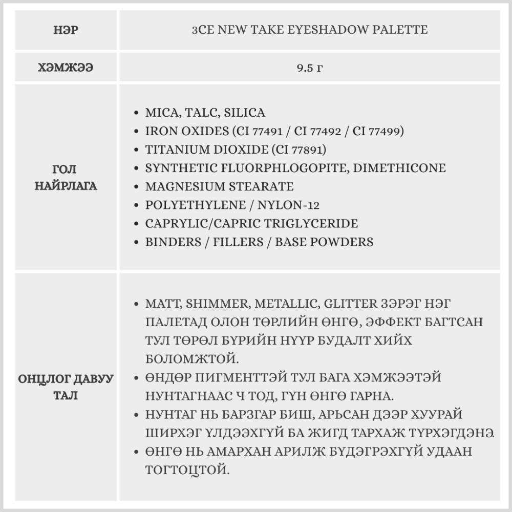 3CE New Take Eyeshadow Palette нь өндөр пигментацтай, зөөлөн бүтэцтэй, матт болон гялалзсан өнгөнүүдийг нэг дор багтаасан,өдөр тутмын болон гоёлын гээд олон төрлийн будалт хийх боломжтой сайн чанарын нүдний тень юм. Өнгө нь жигд тархах ба удаан тогтоцтой. Багс дагалдана.