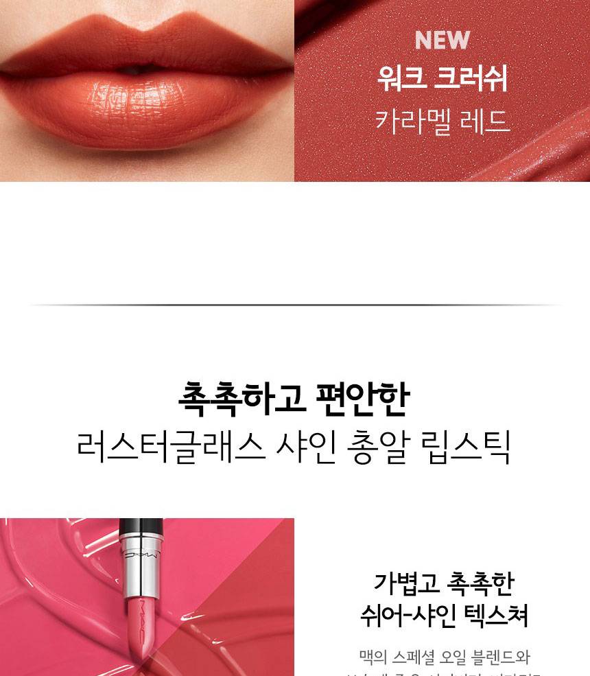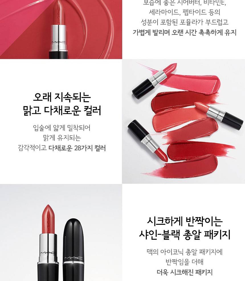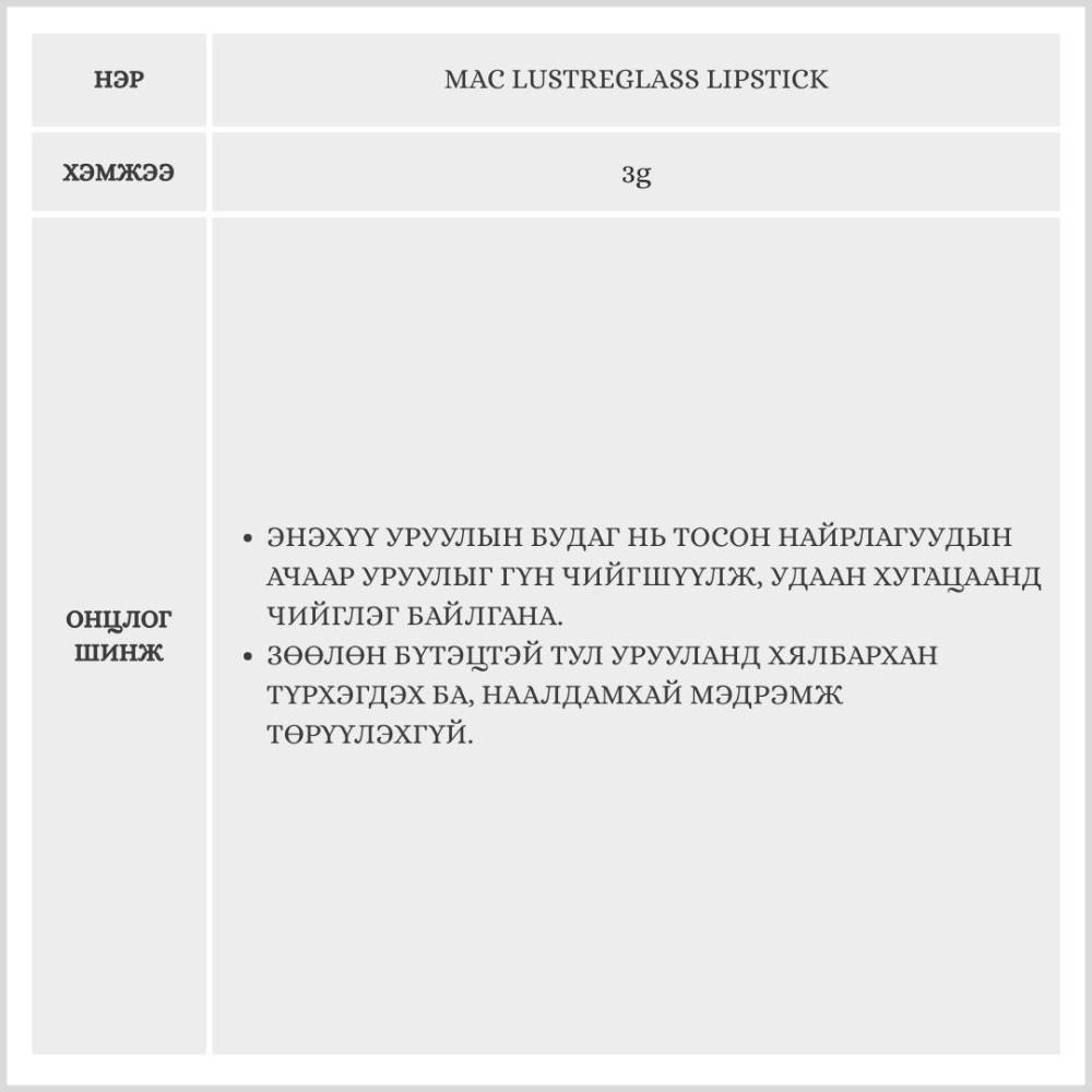 MAC Lustreglass Lipstick нь зөөлөн гэрэлтсэн өнгөтэй уруулын будаг бөгөөд тосоор баяжуулсан найрлагатай тул уруулыг чийгшүүлж зөөлөн болгоно.