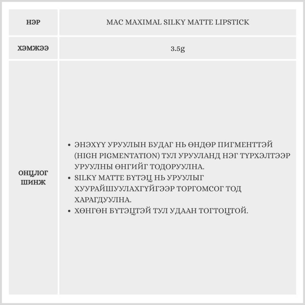 MACximal Silky Matte Lipstick нь гөлгөр, зөөлөн матт эффекттэй уруулын будаг бөгөөд тод, жигд өнгөний гаралттай. Уруулыг хэт хуурайшуулахгүй ба удаан тогтоцтой.