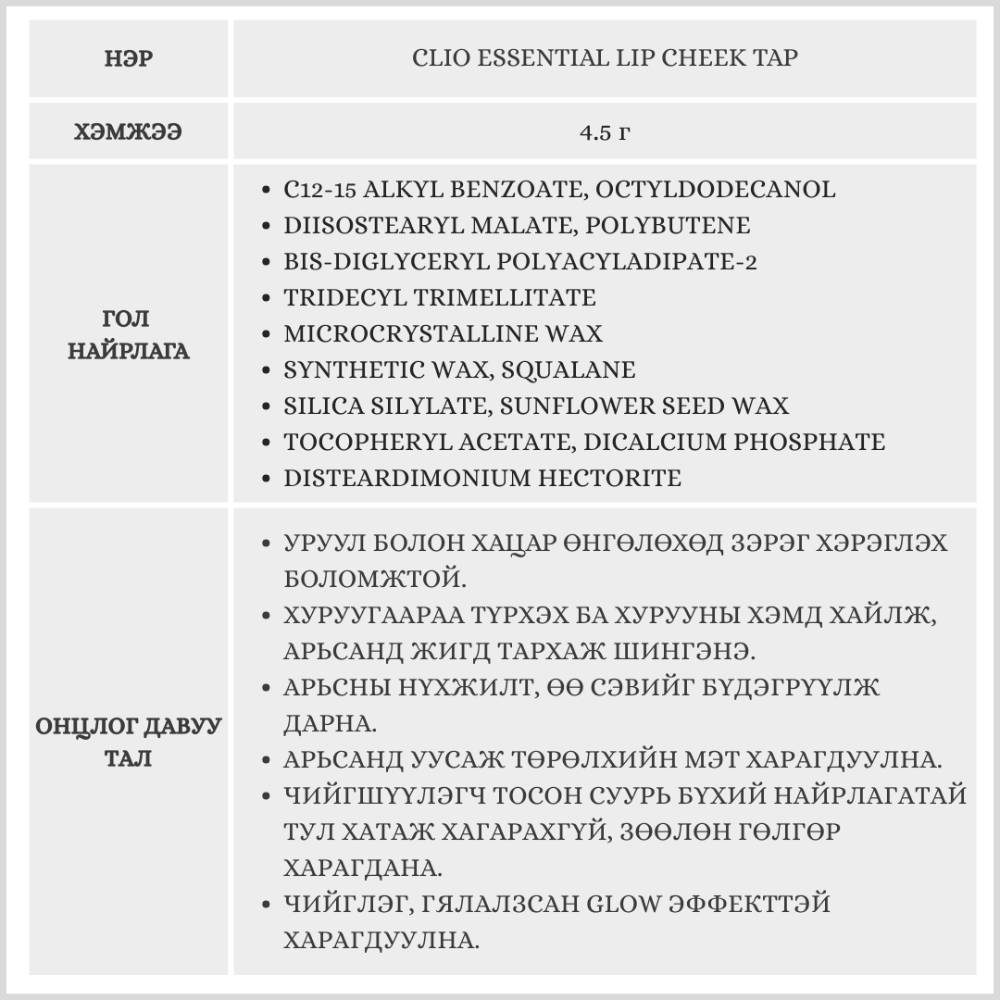 Уруул болон хацарт зэрэг хэрэглэн хослуулан будалт хийх боломжтой хацар өнгөлөгч. Чийглэг, гялалзсан glow эффекттэй харагдуулна.
