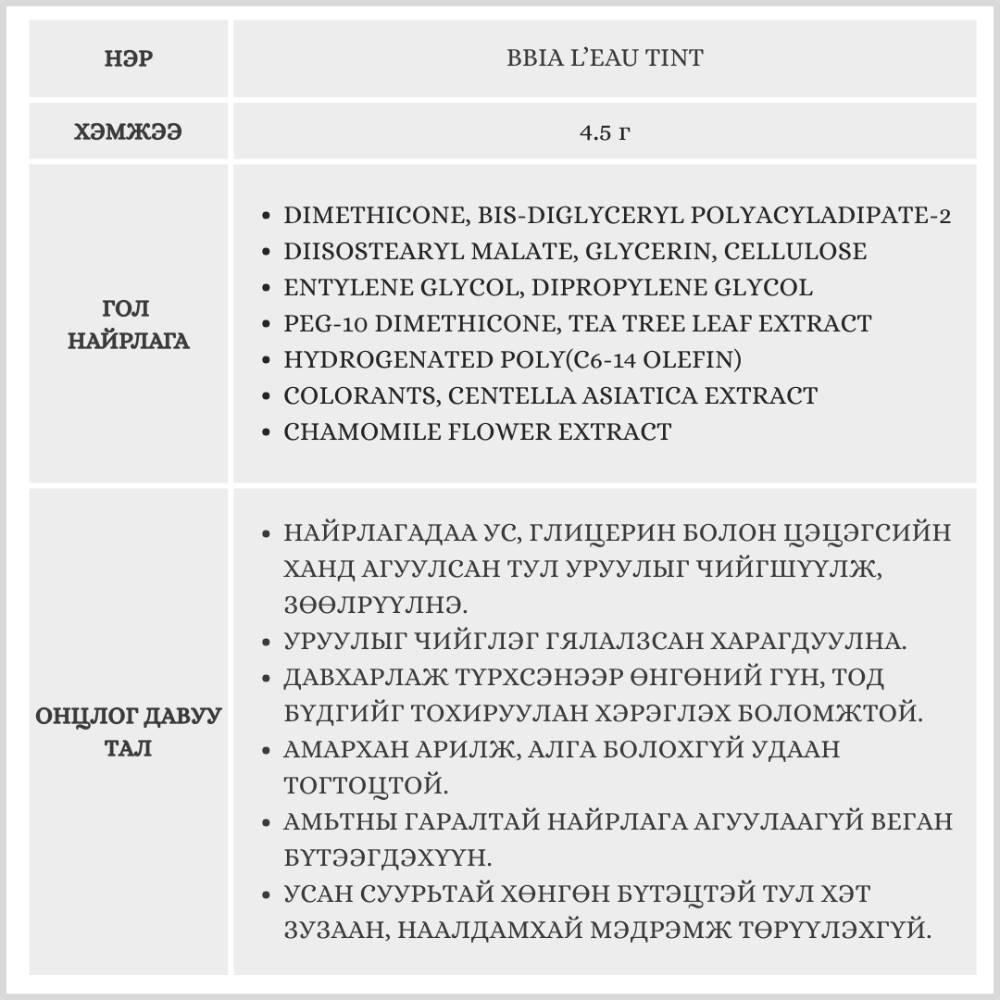BBIA L’eau Tint нь уруулыг чийглэг, гялалзсан төрөлхийн мэт өнгөтэй харагдуулах усан суурьтай уруулын тинт юм. Өдөр тутмын будалтад тохирох хөнгөн бүтэцтэй.