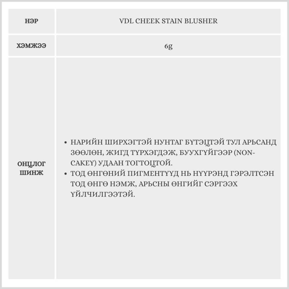 VDL Cheek Stain Blusher нь арьсанд зөөлөн шингэж, удаан тогтоцтой өнгөө хадгалах powder хацар өнгөлөгч юм.