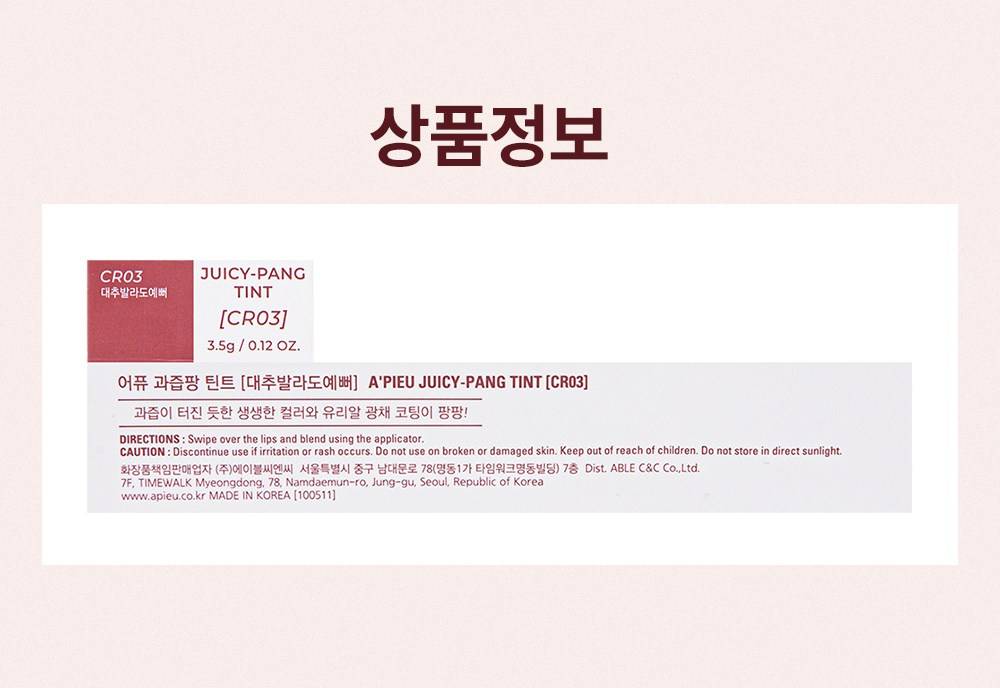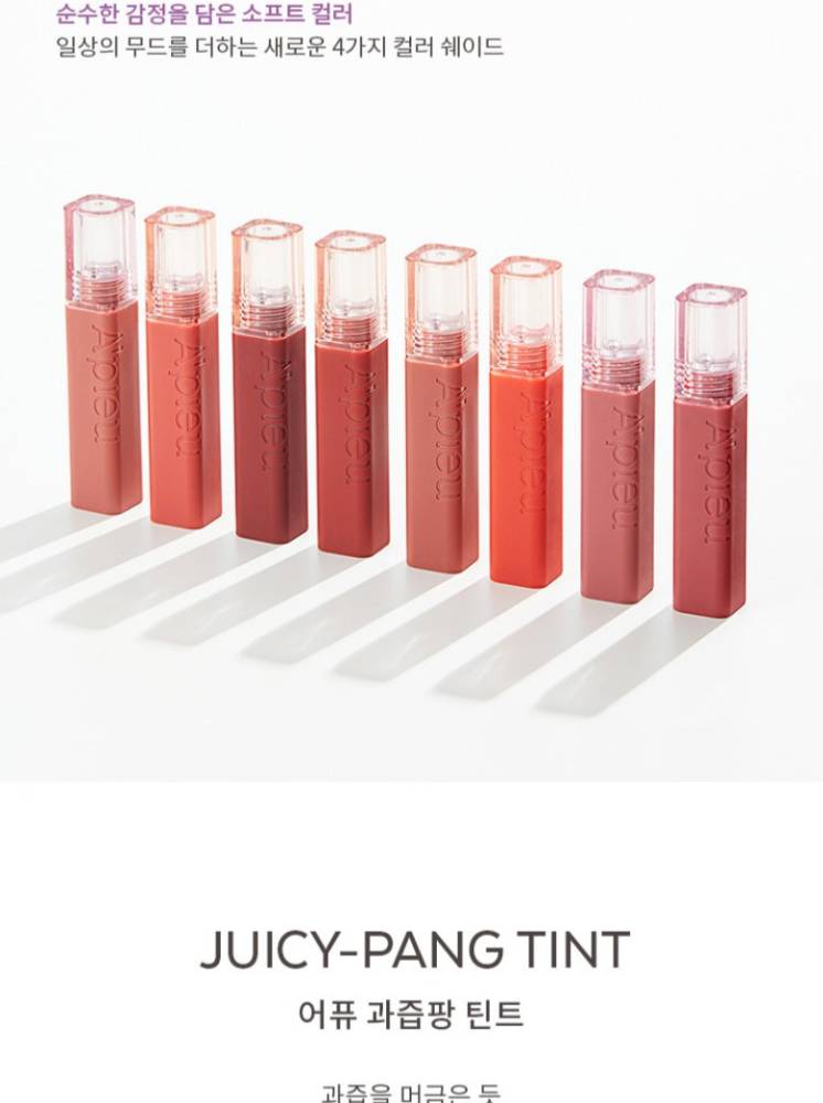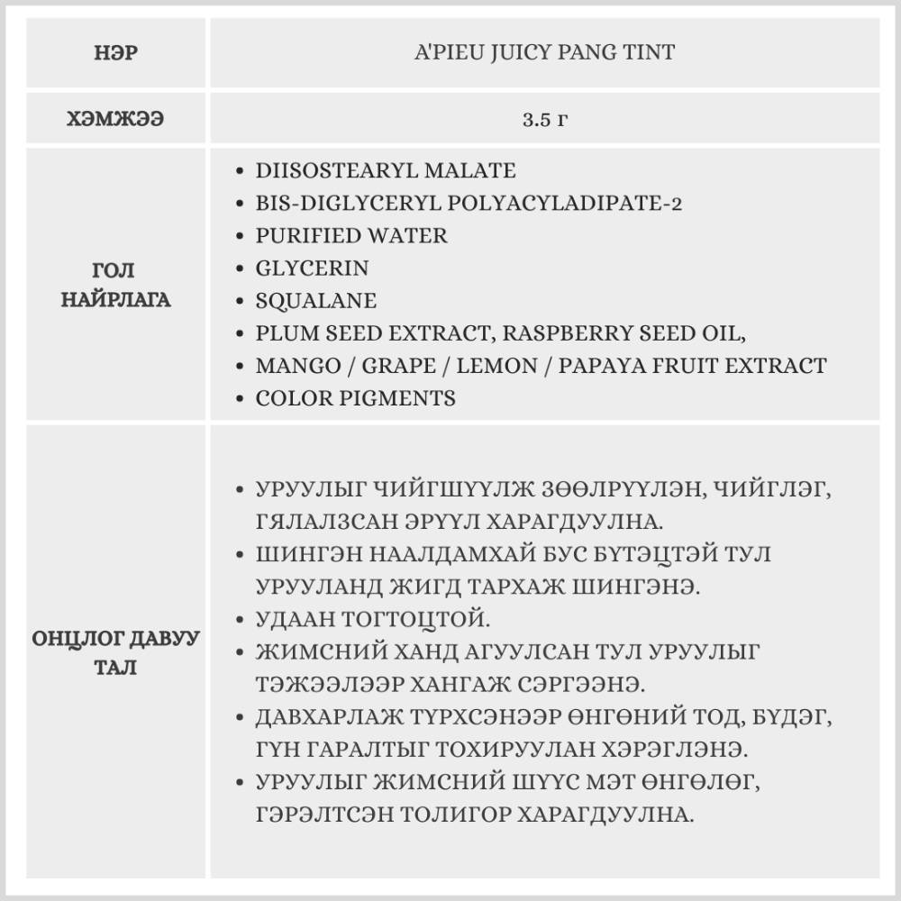 A’pieu Juicy Pang Tint нь уруулыг жимсний шүүс мэт чийглэг, гялалзсан харагдуулах хөнгөн бөгөөд ус-гель бүтэцтэй уруулын тинт юм. Уруулыг чийгшүүлж, зөөлөн болгох ба удаан тогтоцтой.