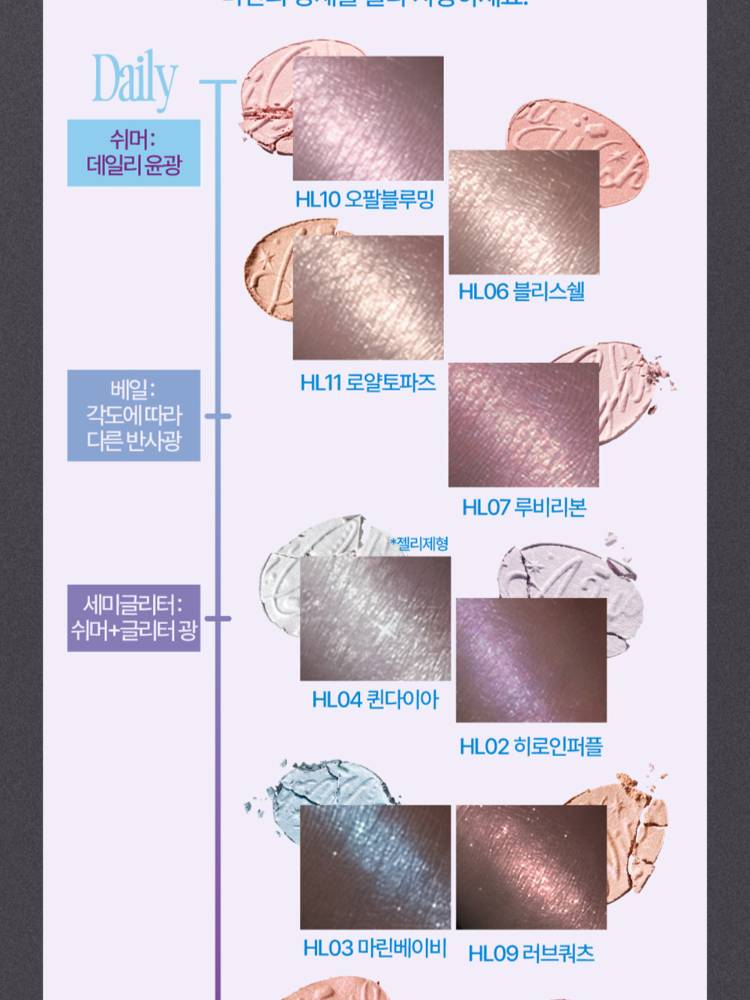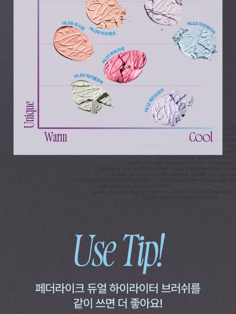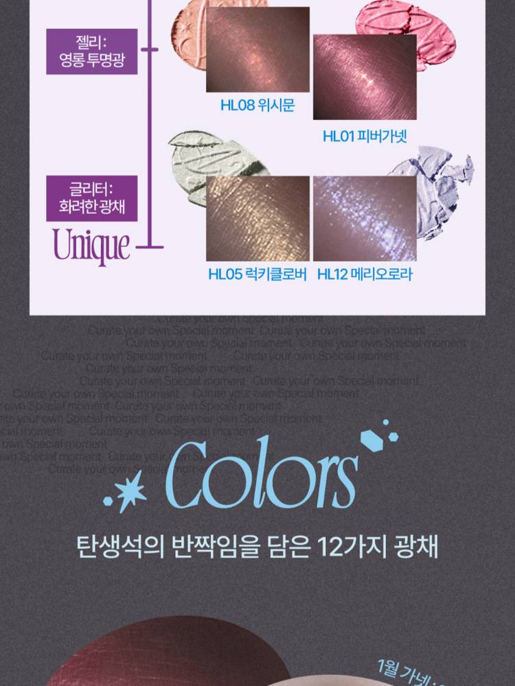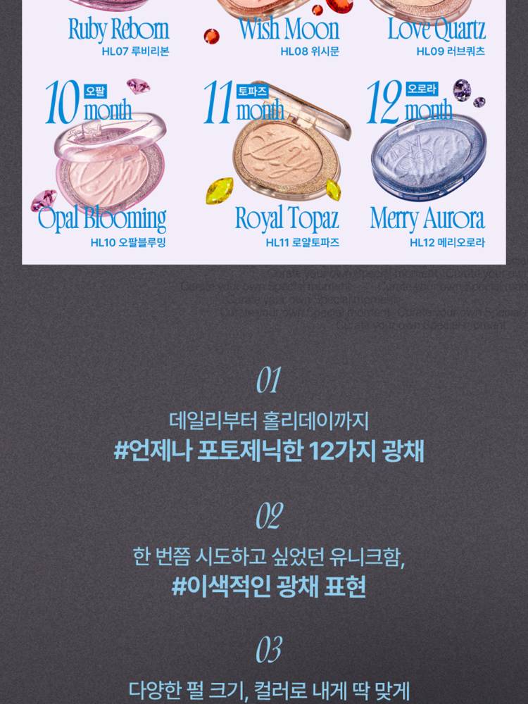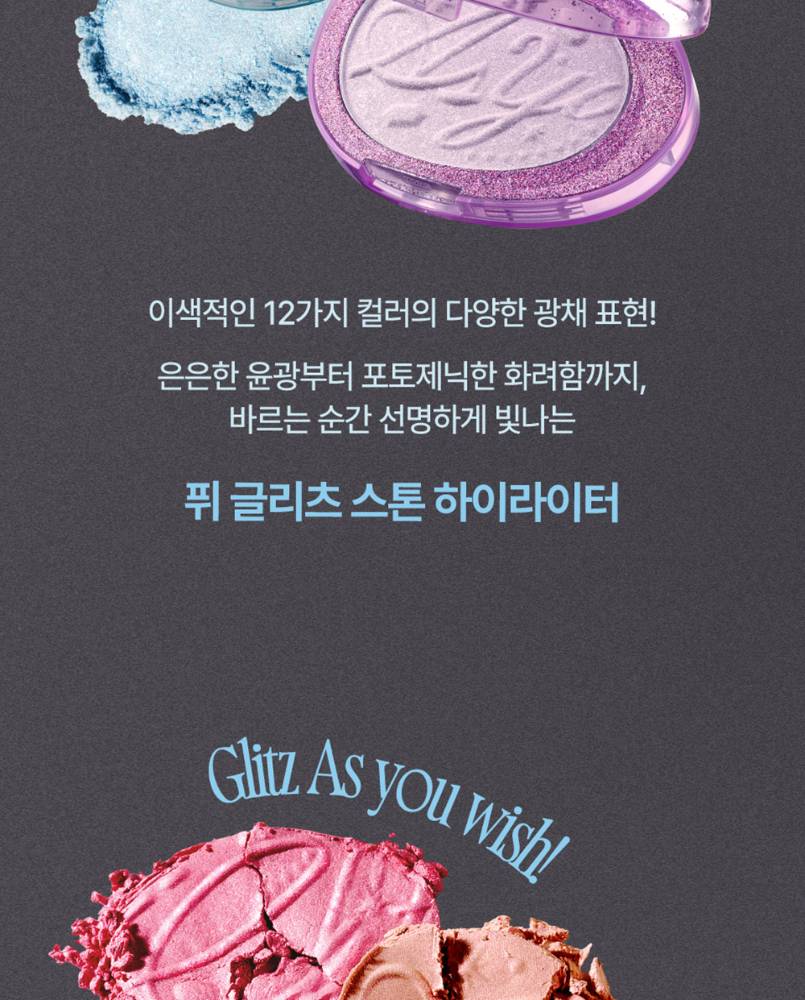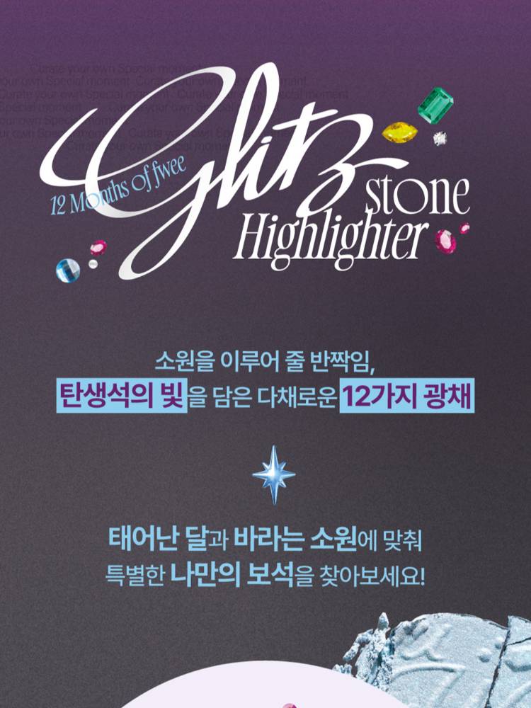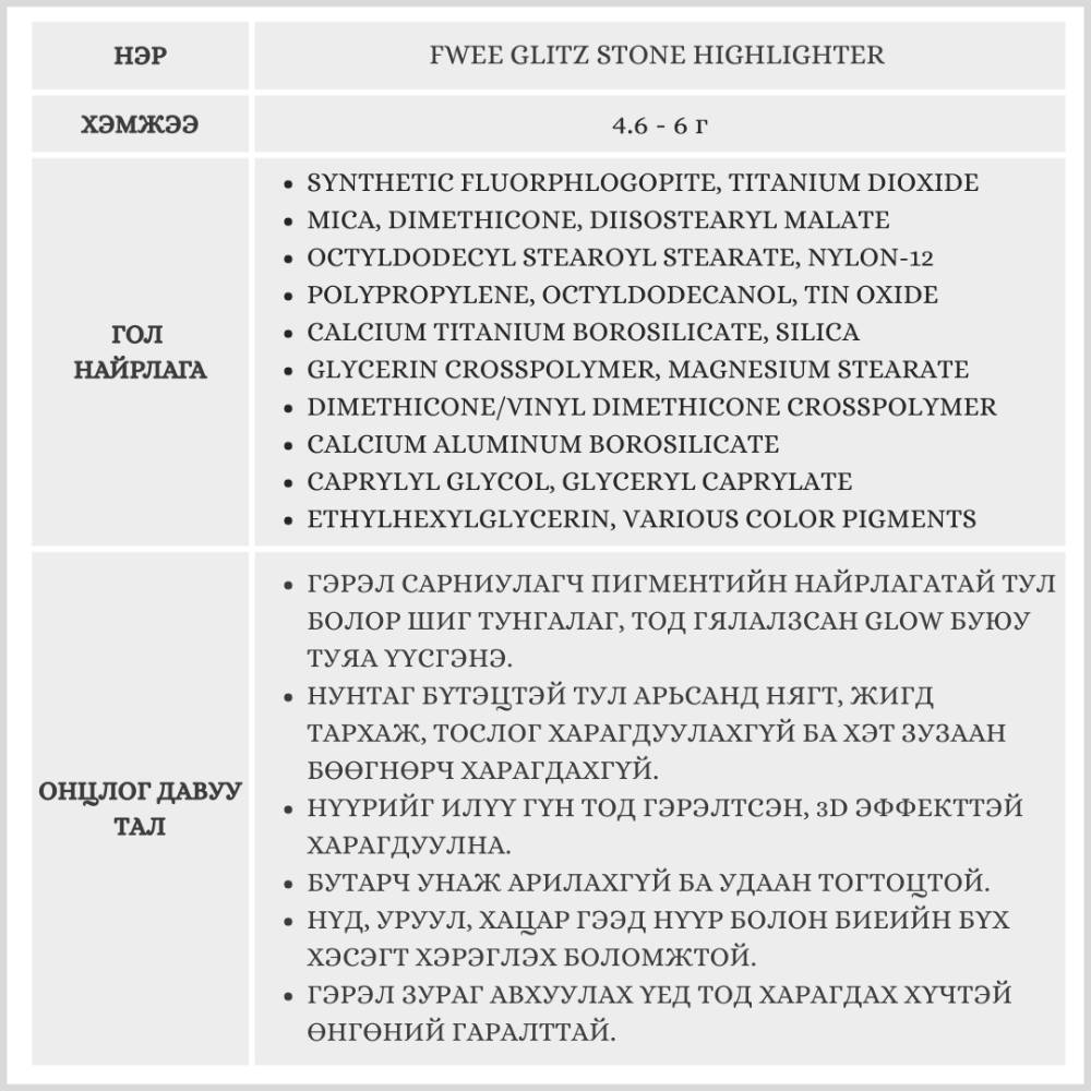 Fwee Glitz Stone Highlighter нь арьсанд тансаг чулуун-гялтгануур мэт гэрэл нэмдэг, шиммер & глиттер хосолсон гэрэлтүүлэгч юм. Арьсанд уусаж төрөлхийн мэт харагдах зөөлөн бүтэцтэй ба удаан тогтоцтой.