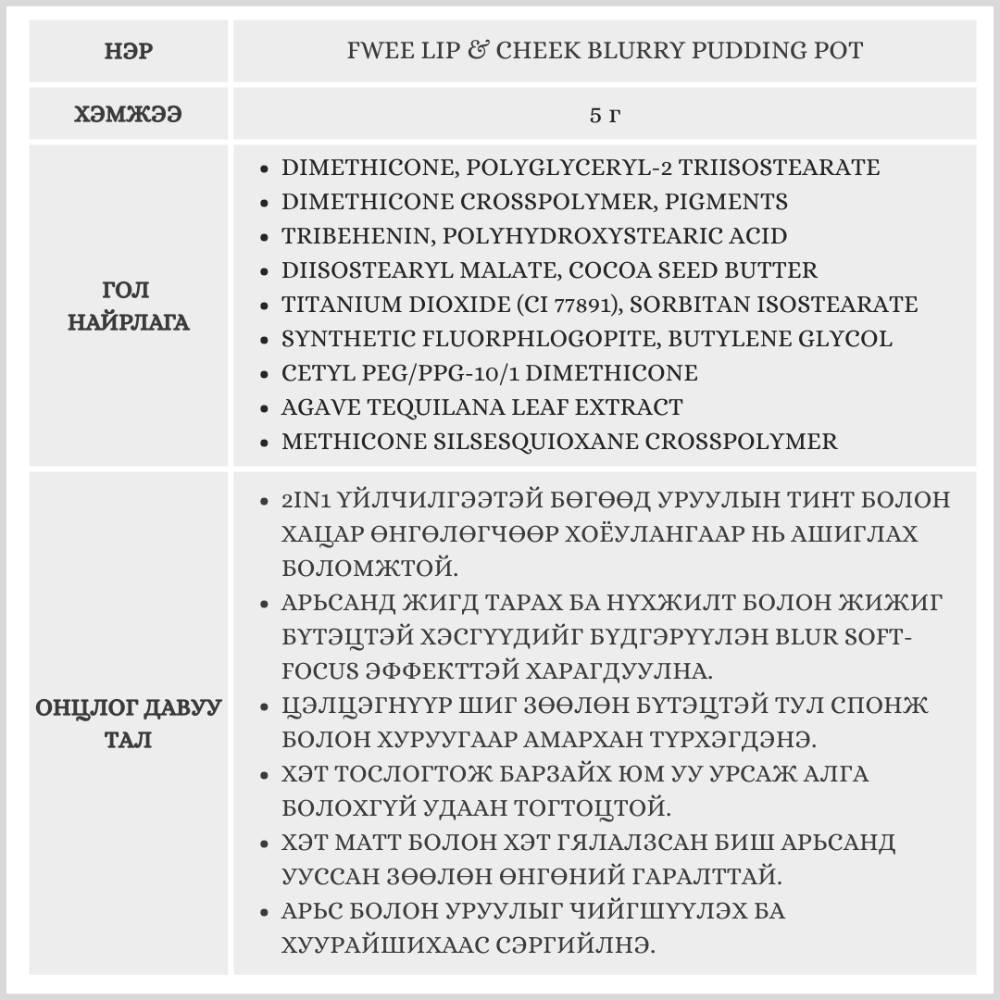 Fwee Lip & Cheek Blurry Pudding Pot, 5g /Хацар, уруул өнгөлөгч/