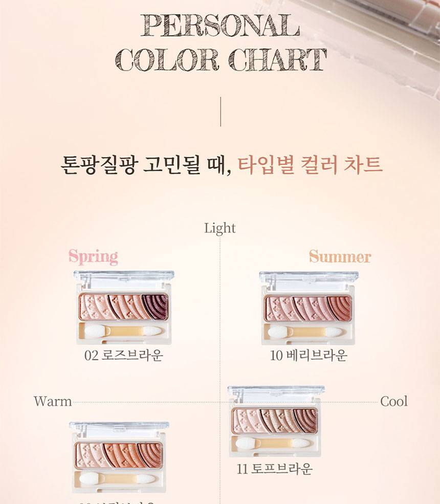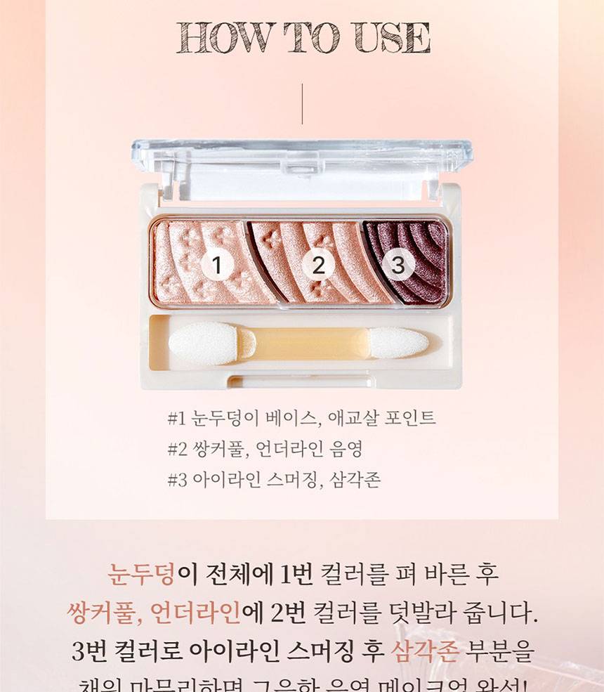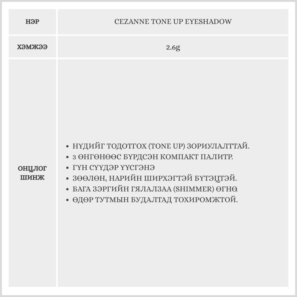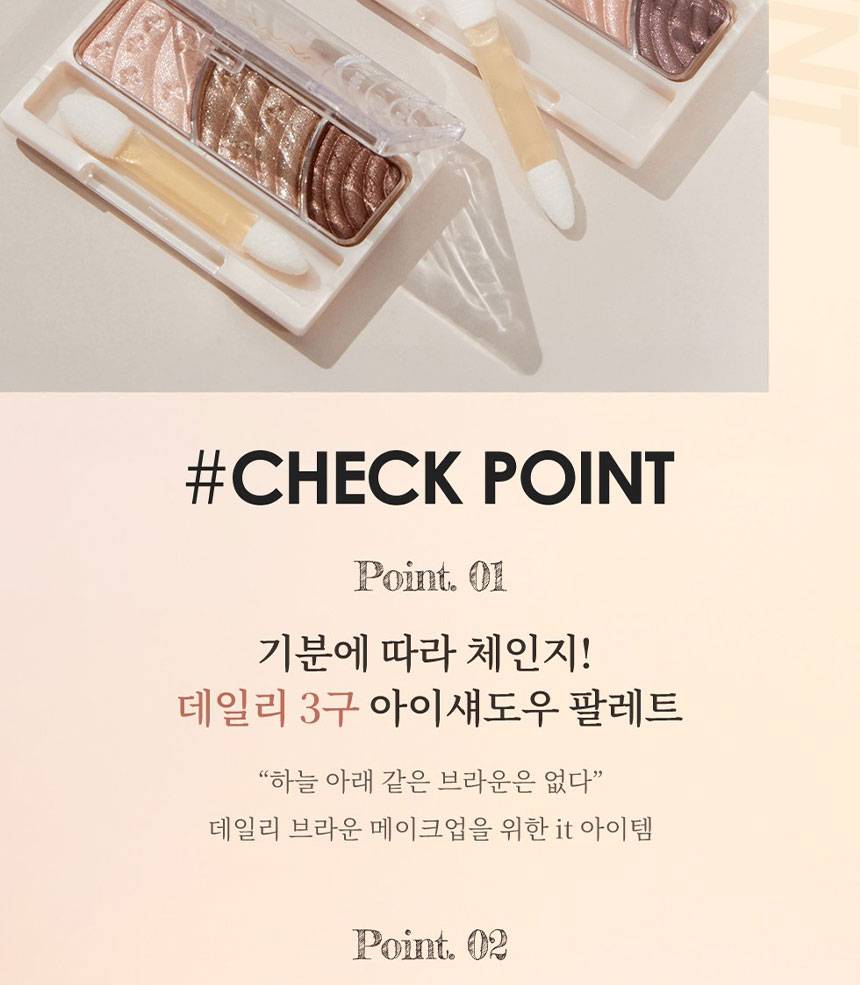 3 өөр өнгийг нэгтгэсэн, нүдний жижиг тень бөгөөд, нүдийг тодотгож, Tone Up өгнө. Энэхүү тениуд нь нүдэнд гүн сүүдэр үүсгэх үндсэн өнгө, Tone Up, болон нүдийг томруулж харагдуулах гэсэн гурвалсан хэсгээс бүрдсэн.