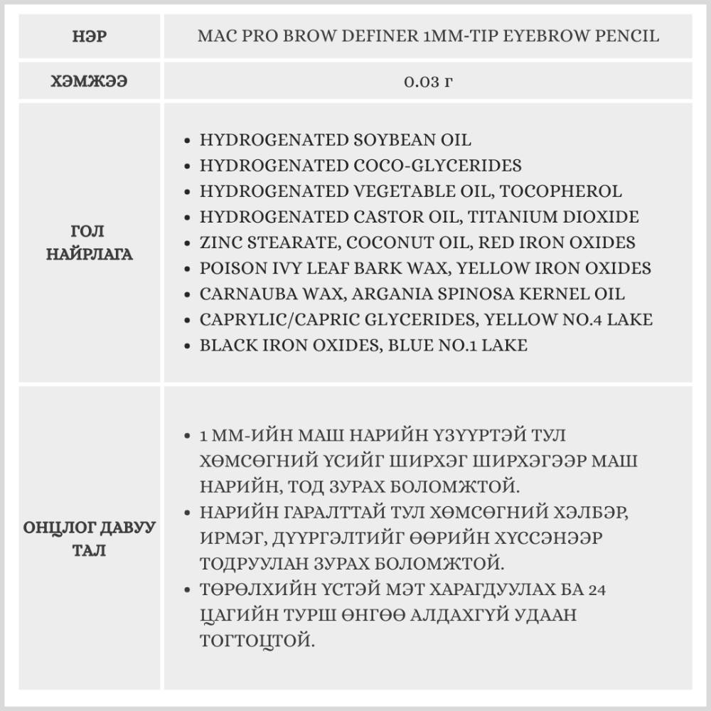 MAC Pro Brow Definer 1mm Tip нь 1 мм-ийн нарийн үзүүртэй, хөмсөгний үсийг нэг бүрчлэн зурах боломжтой хөмсөгний харандаа юм. Жигд, тод гаралттай бөгөөд удаан тогтоцтой.