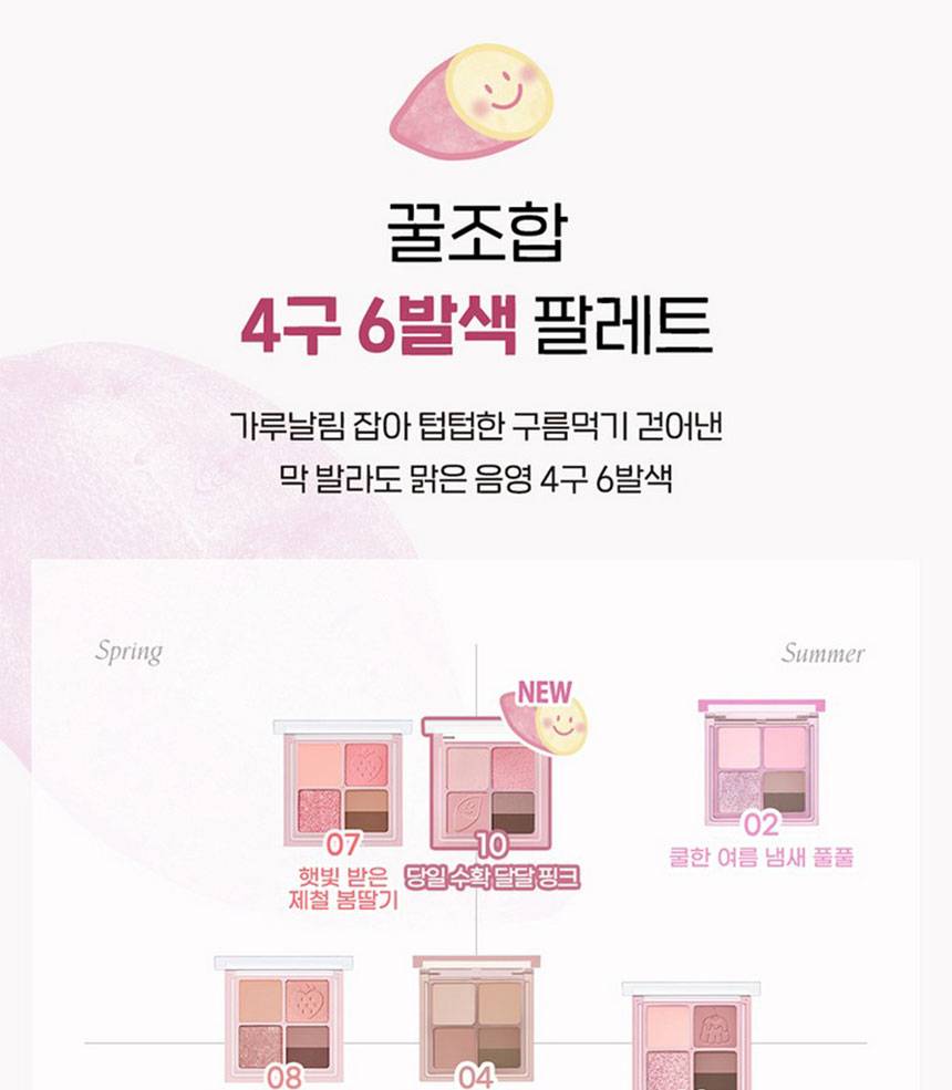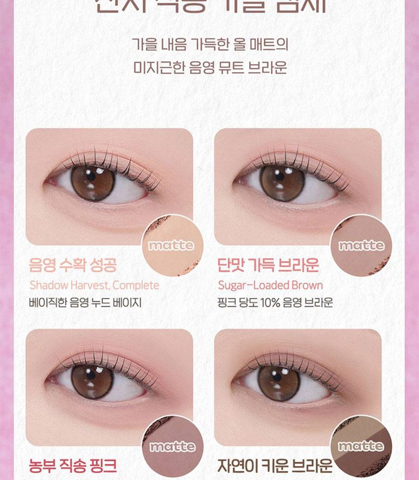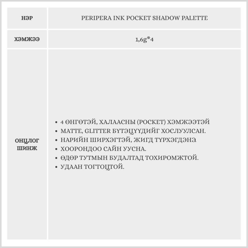 Matte, Shimmer, Glitter зэрэг төрлийн бүтэцтэй өнгөнүүдийг хослуулсан бөгөөд, нүдэнд тод өнгө өгөхөөс гадна, хөнгөн, өдөр тутмын будалт хйихэд тохиромжтой.