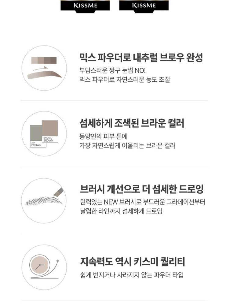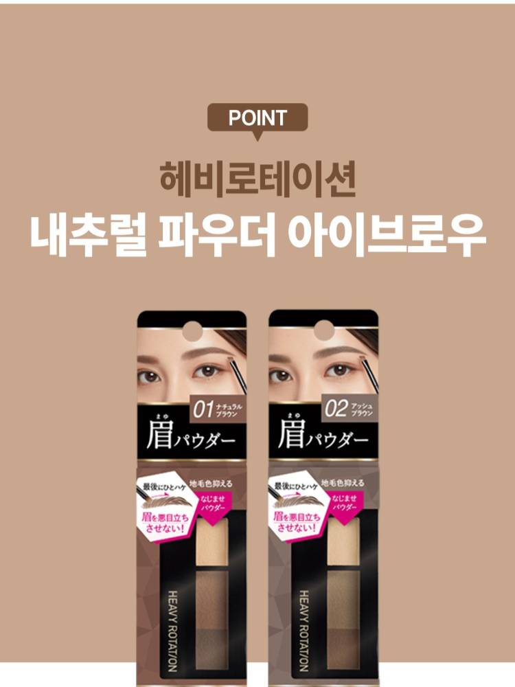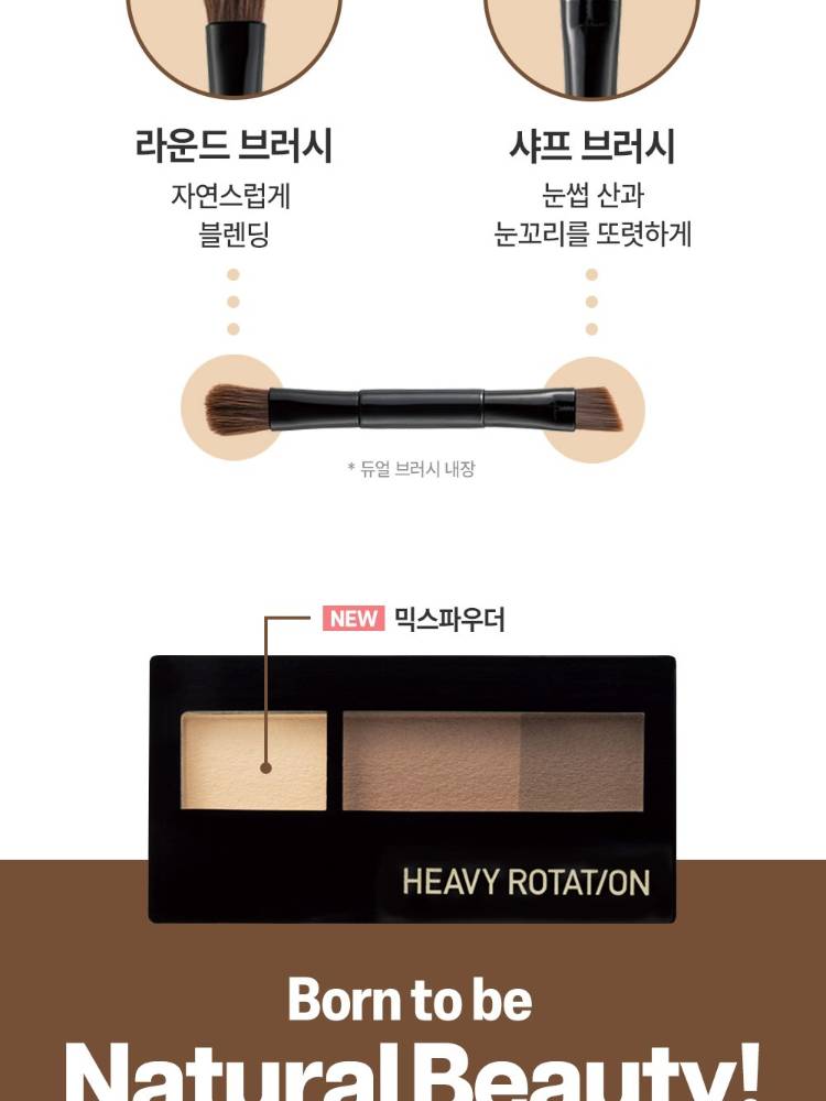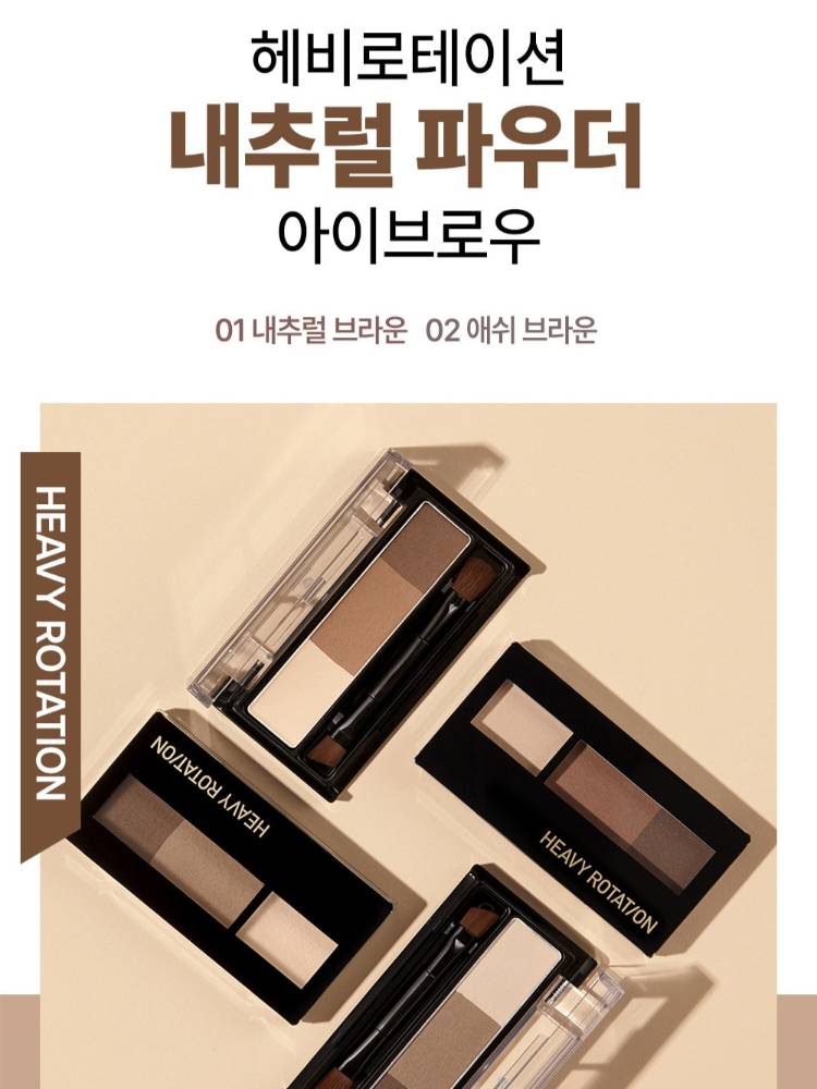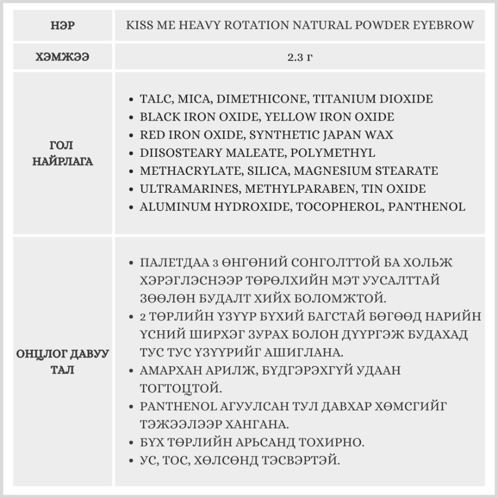 Kiss Me Heavy Rotation Natural Powder Eyebrow нь зөөлөн матт гаралттай нунтаг бүтэцтэй хөмсөгний тень юм. Палетдаа 3 төрлийн өнгөтэй тул уусалттай будалт хийх боломжтой ба жигд, тод гаралттай.