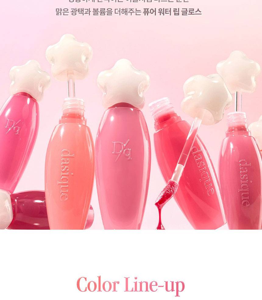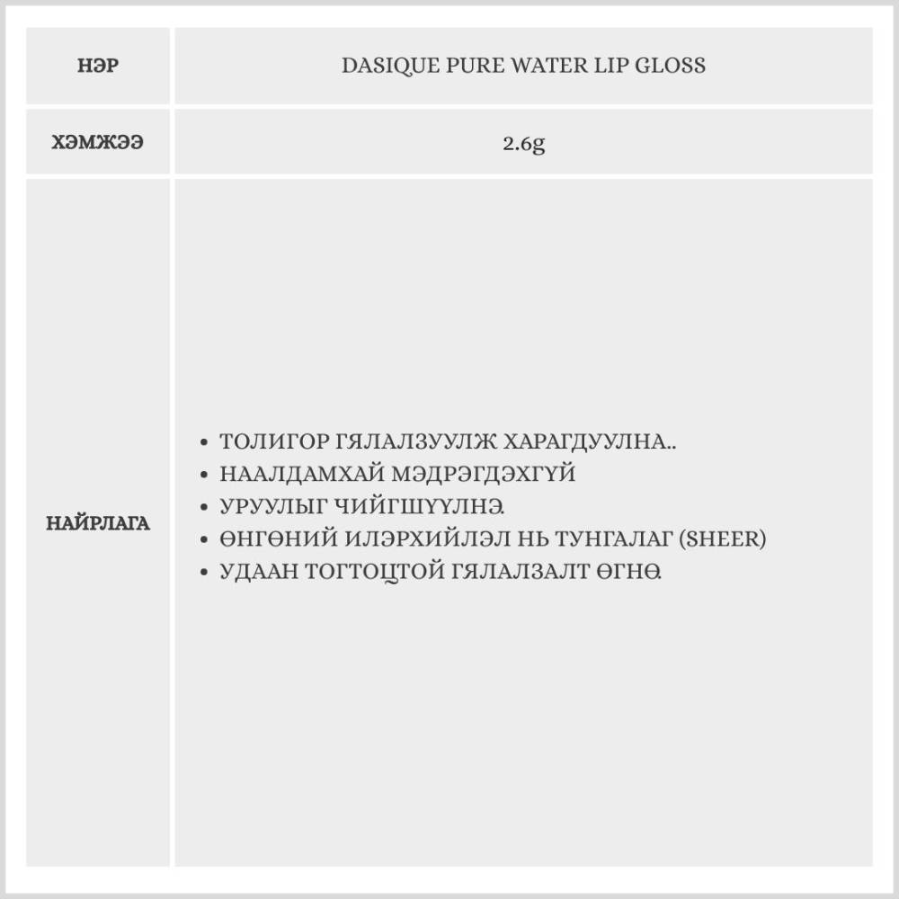 Dasique Pure Water Lip Gloss уруул өнгөлөгч нь наалдамхай биш бүтэцтэй бөгөөд, уруулыг чийгшүүлж, өнгөлөг харагдуулна. Уруулын будагтай хамт эсвэл дангаар нь хэрэглэхэд тохиромжтой.