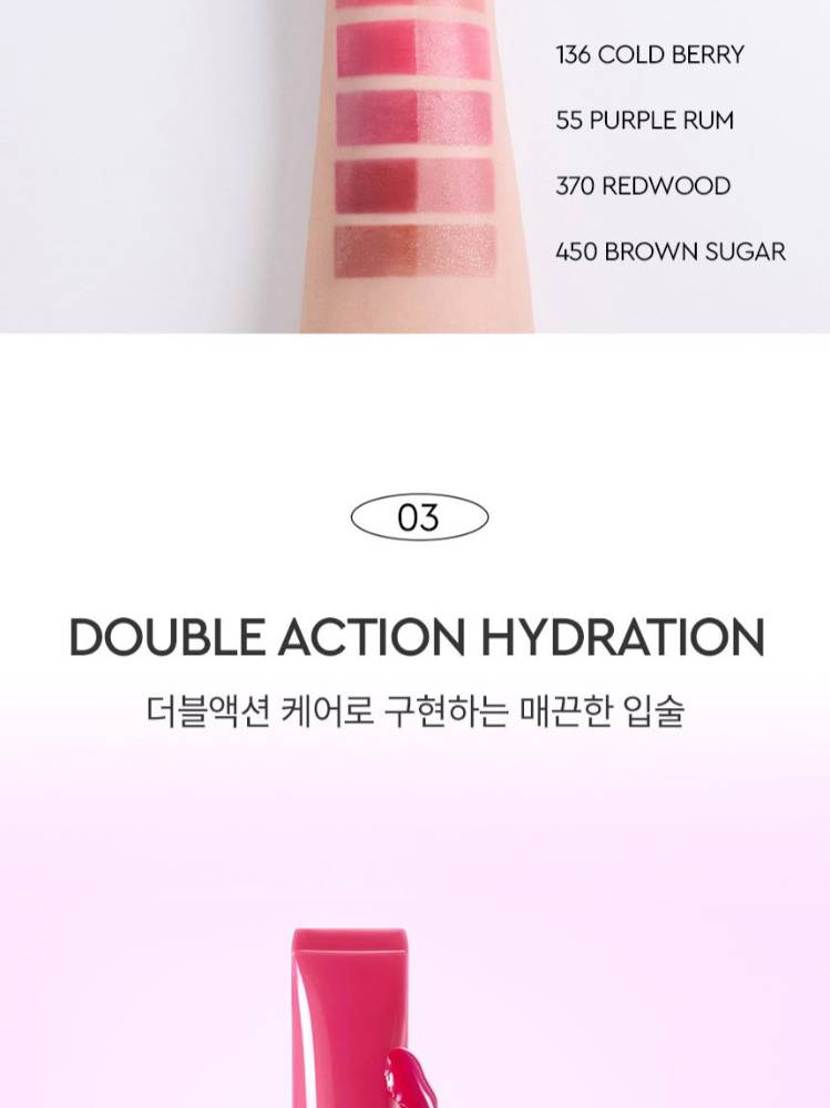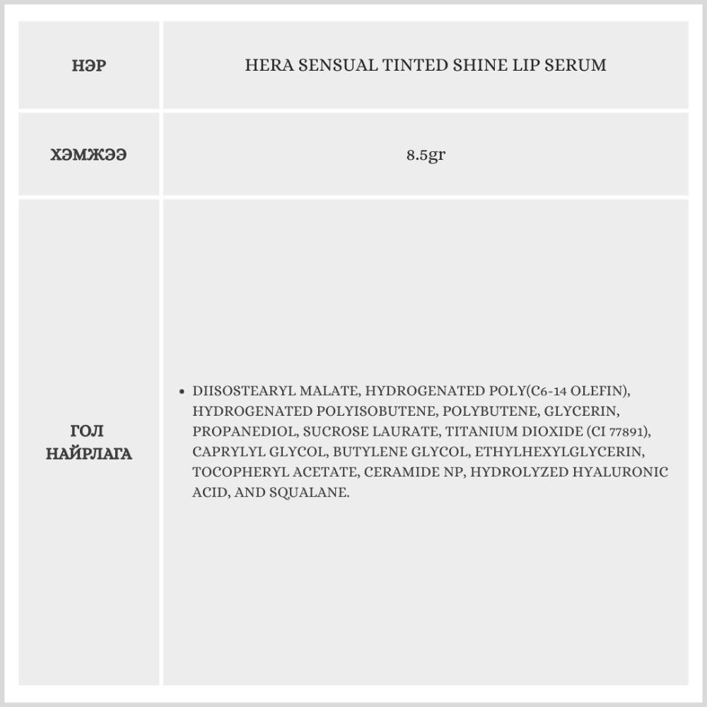 Энэхүү бүтээгдэхүүн нь 6 өнгийн сонголттой, гялалзуулдаг дээд зэргийн уруул өнгөлөгч юм. Уруулийг өөрийнх нь байгалийн өнгө мэт уусган, эрүүл чийглэг харагдуулна.