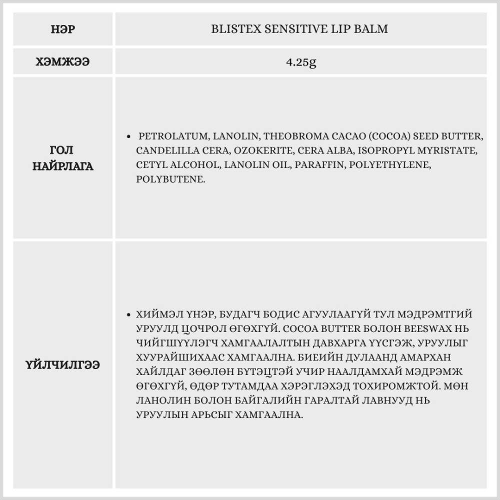 Нэмэлт амт, үнэр, өнгө оруулагч оруулаагүй тул маш мэдрэмтгий уруултай хүмүүст зориулсан харшил өгөхгүй, зөөлөн бүтэцтэй бүтээгдэхүүн юм.