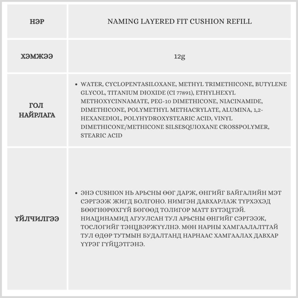 Солонгосын NAMING брэндийн cushion нь арьсны өнгийг жигд болгож, өө сэвийг дарж, арьсны өөрийнх нь байгалийн өнгийн тодотгоно. Өдөр тутмын будалтанд тохиромжтой. /Зөвхөн запас бүтээгдэхүүн/