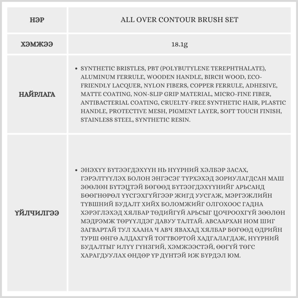 Энэхүү багц нь нүүрний хэлбэр засах contour, гэрэлтүүлэх highlight, болон өнгө оруулах blush үйлдлийг нэг дор багтаасан бүгд нэг дороос хэрэглэж болох цогц палетт юм.