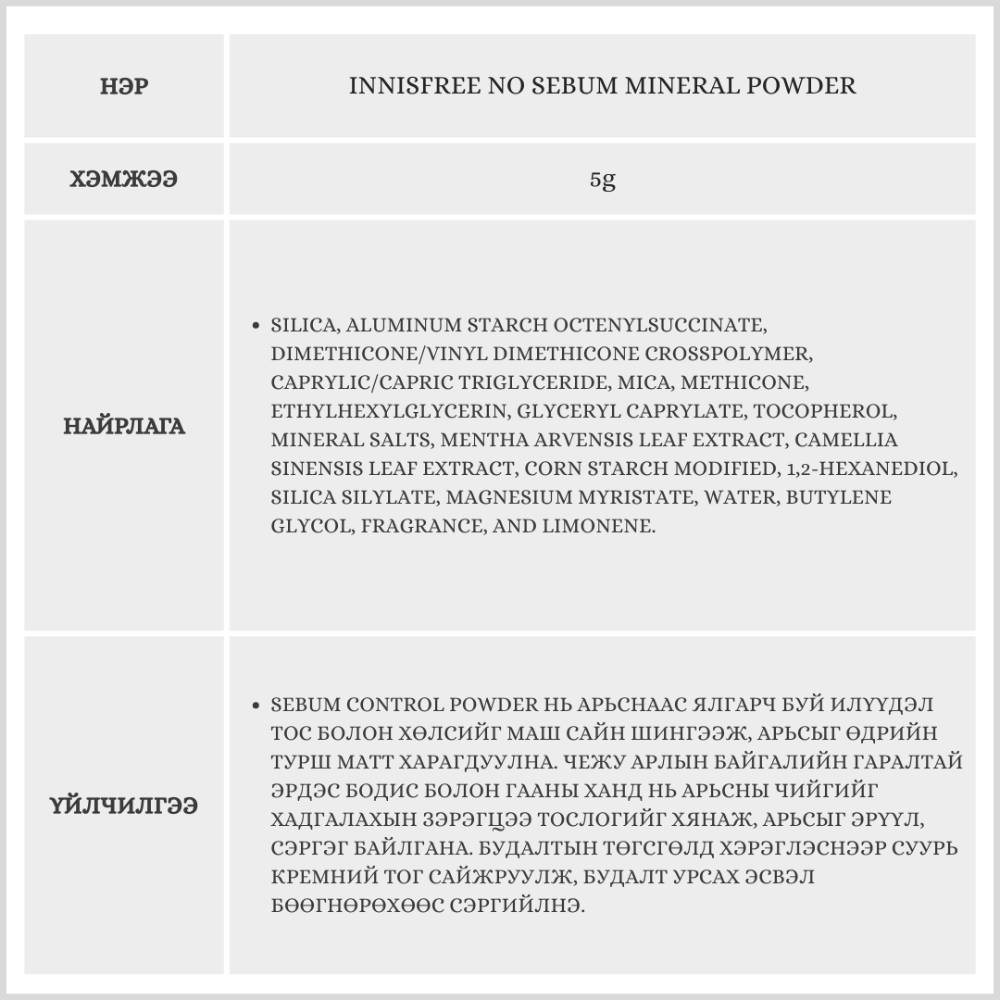 Арьсны илүүдэл тос болон хөлсийг маш сайн шингээж, арьсыг өдрийн турш шинэлэг, матт харагдуулна.