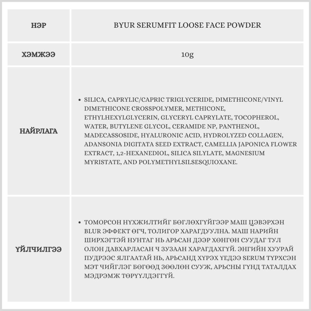 Маш нарийн ширхэгтэй нунтаг нь арьсан дээр хөнгөн суудаг тул олон давхарласан ч зузаан харагдахгүй. Зөвхөн гоо сайхны бүтээгдэхүүн биш, дотроо коллаген, гиалуроны хүчил, церамид агуулсан тул арьсыг тань өдрийн турш хамгаалж, тэжээл өгнө.