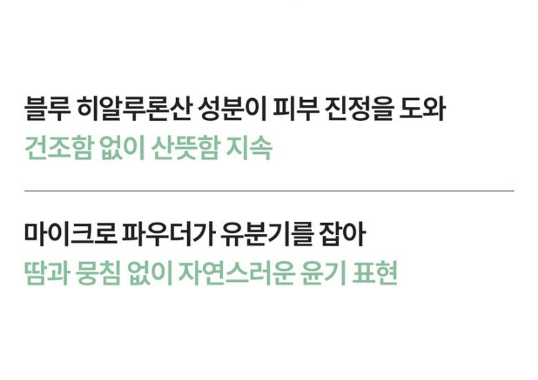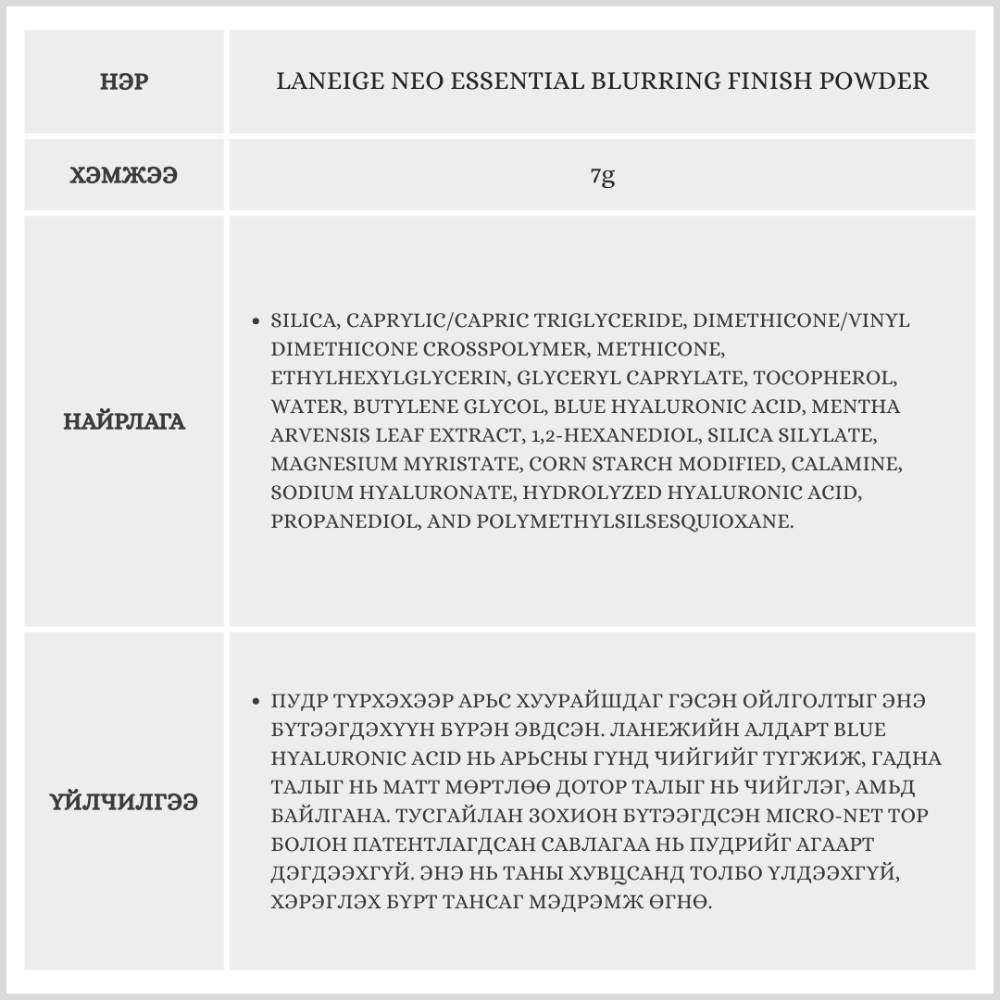 Ланежийн патентлагдсан хэт жижиг молекултай цэнхэр гиалуроны хүчил агуулсан тул пудр түрхсэний дараа ч арьс дотроосоо чийглэг, тав тухтай мэдрэмж өгнө.