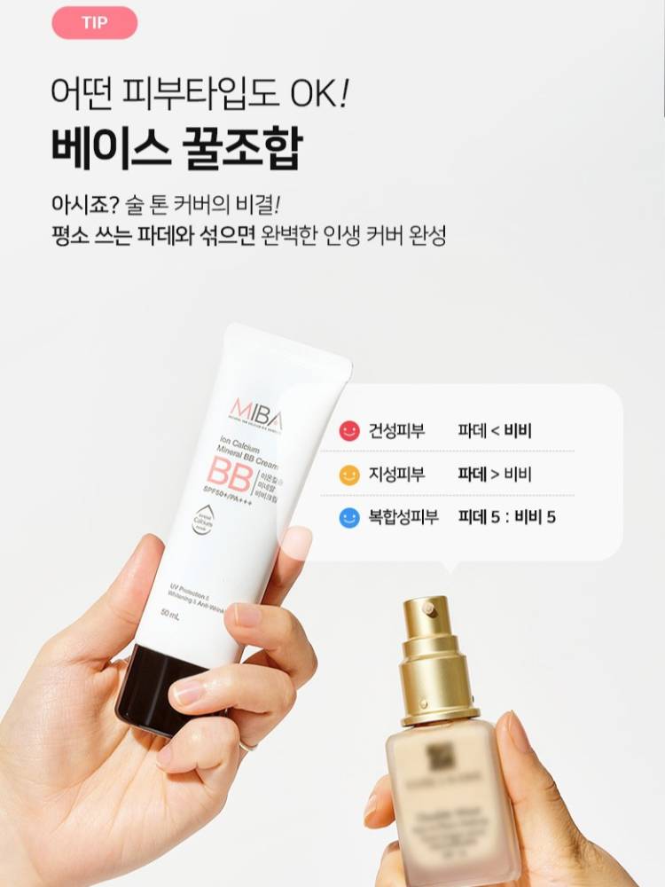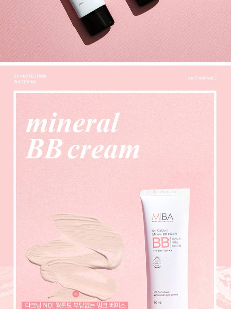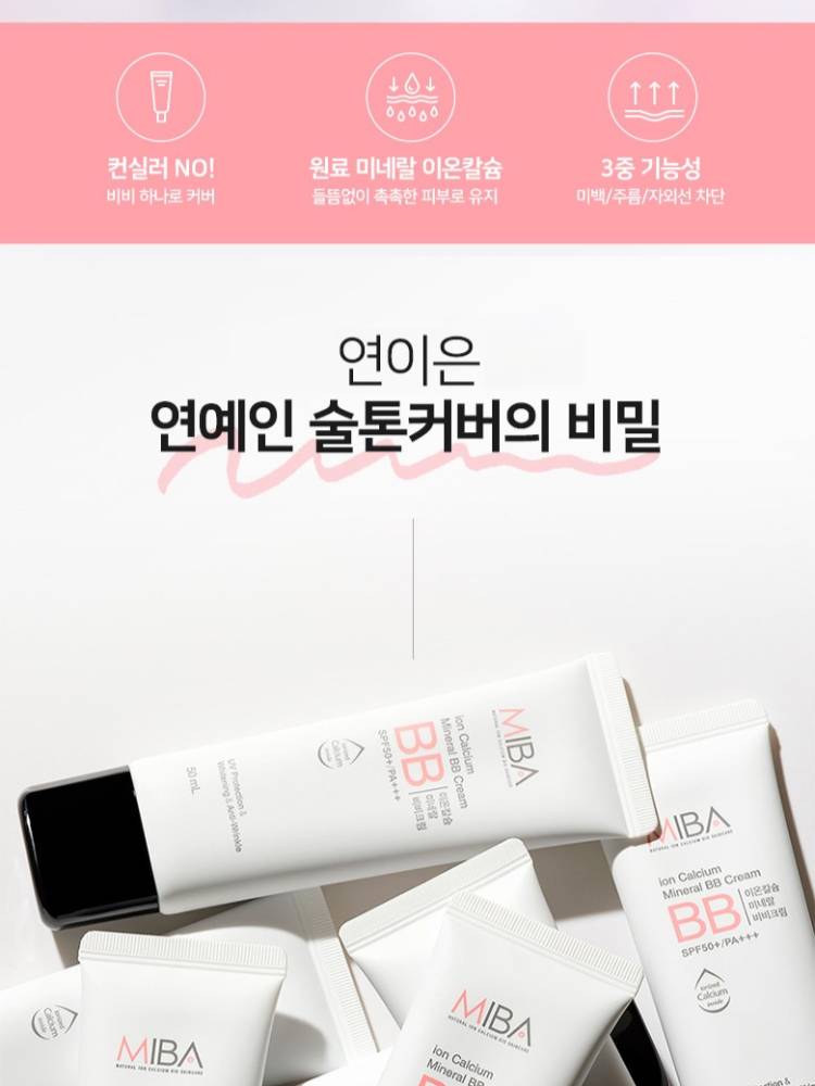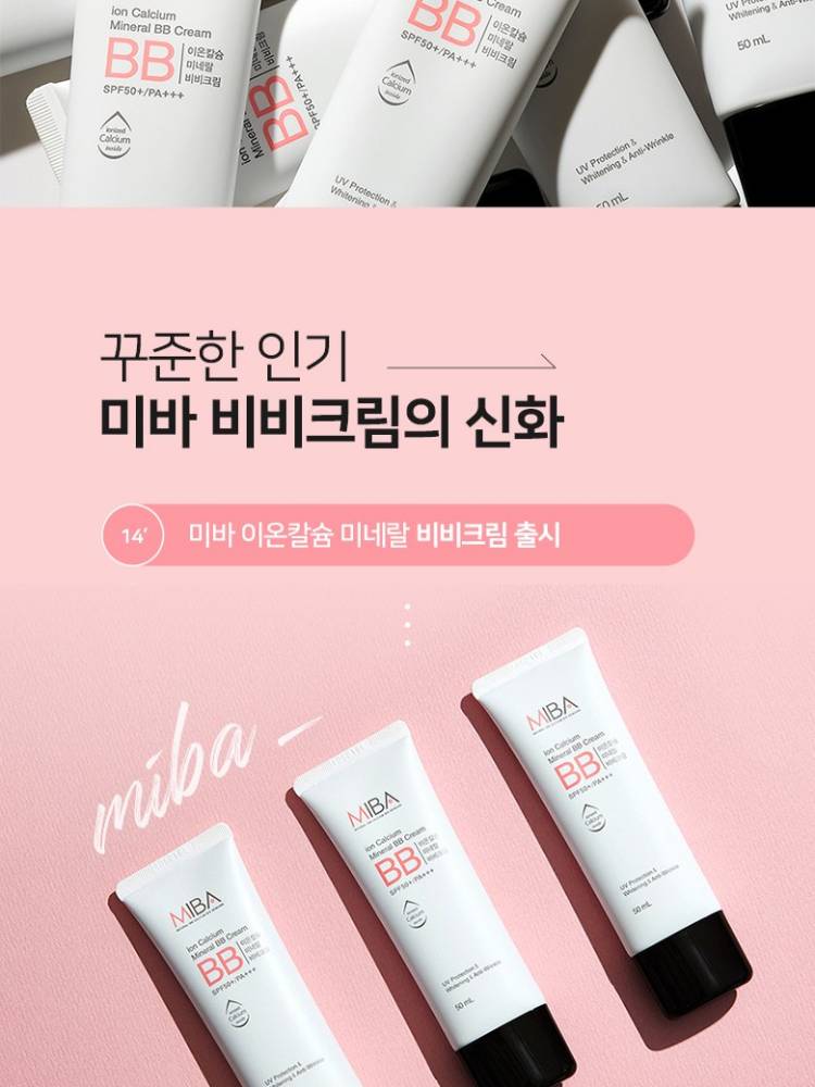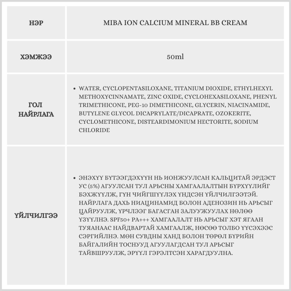 Солонгосын MIBA брэндийн BB крем нь өөрөөсөө SPF50+ PA+++ нарны хамгаалттай бөгөөд арьсны өө сэвийг жигд болгож, өнгийг сэргээнэ. Хөнгөн бүтэцтэй, чийгшүүлэх найрлагатай тул арьсанд чийглэг мэдрэмж төрүүлнэ.