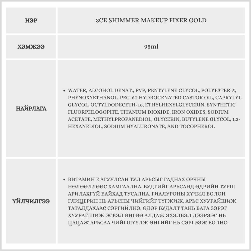 3CE Shimmer Makeup Fixer Gold /Будаг түгжигч/ | Monpang