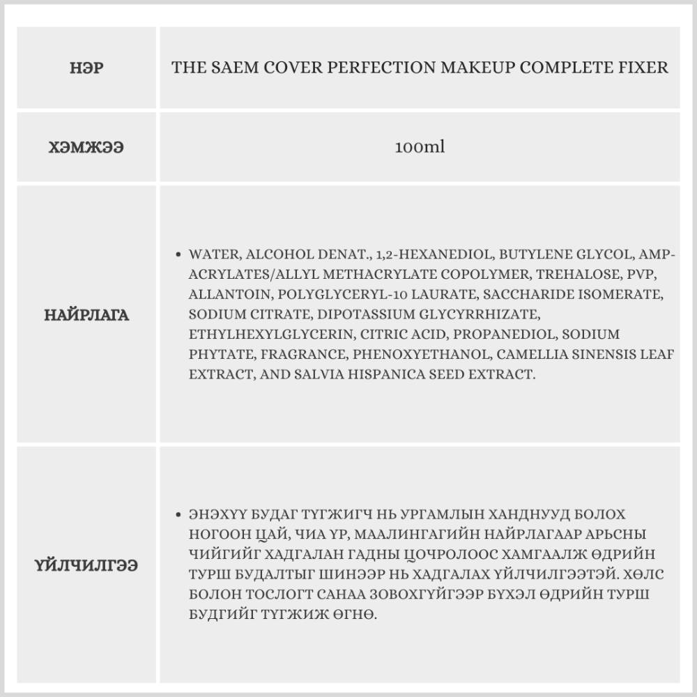 The Saem брэндийн Cover Perfection цувралын бүтээгдэхүүн бөгөөд нүүрний будгийг арьсанд маш сайн шингээж хувцас, маск болон гар утсанд будалт наалдаж үлдэхээс хамгаална.