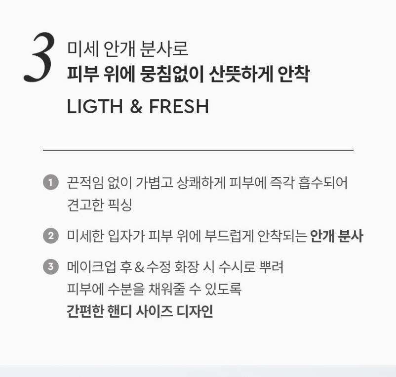 Нүүрээ будхаас өмнө болон дараа цацаж хэрэглэх бөгөөд крем болон кушоныг арьсанд маш сайн шингээнэ.