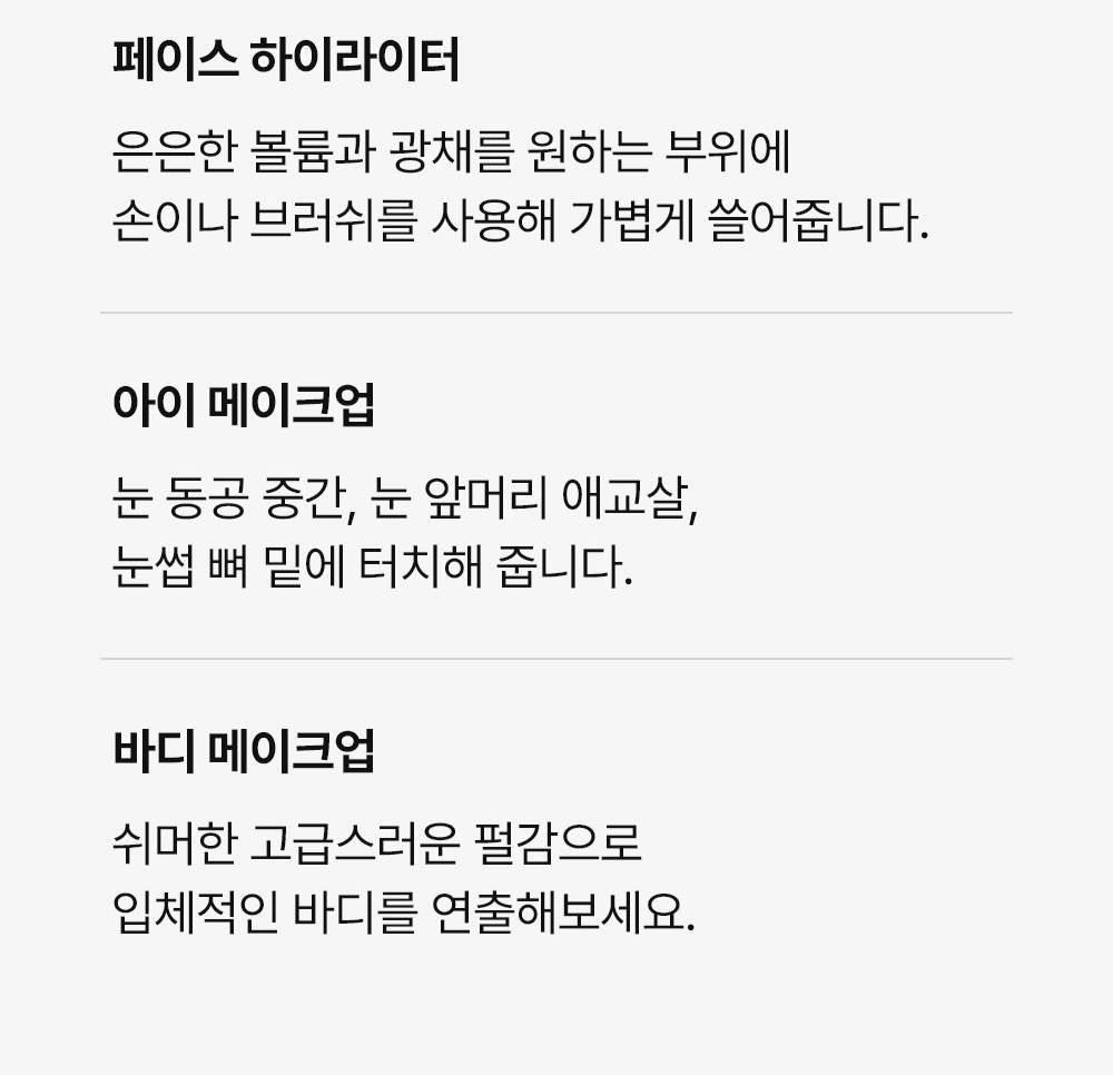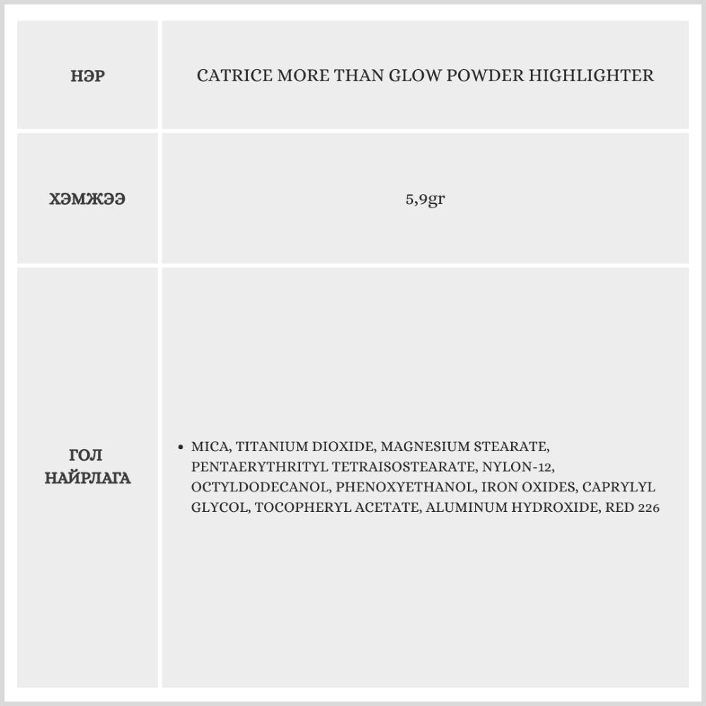 Энэхүү бүтээгдэхүүн нь арьсанд түрхэхэд маш тод, торгомсог гэрэлтэлт өгнө.Нарийн ширхэгтэй тул арьсан дээр толигор, жигд гялалзсан харагдуулна.