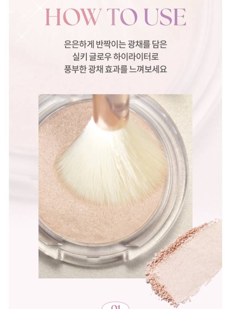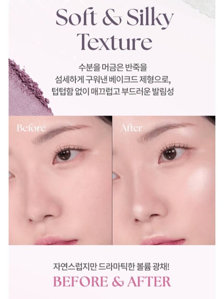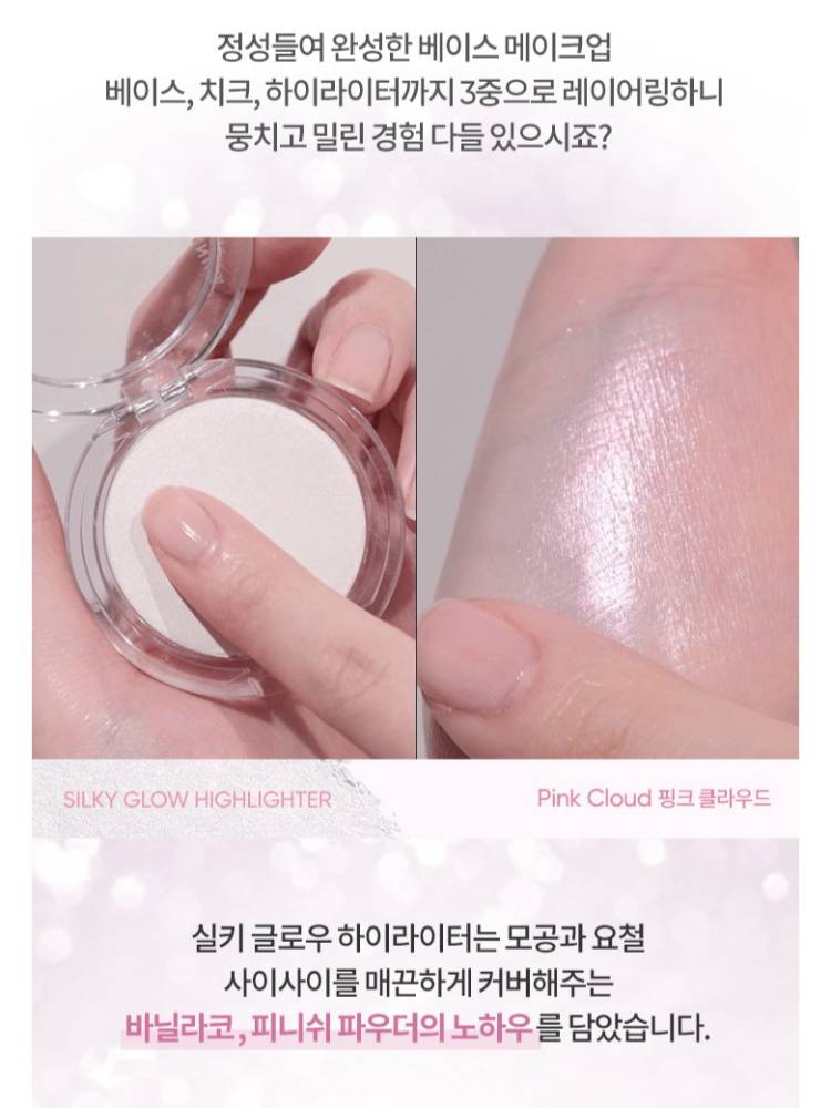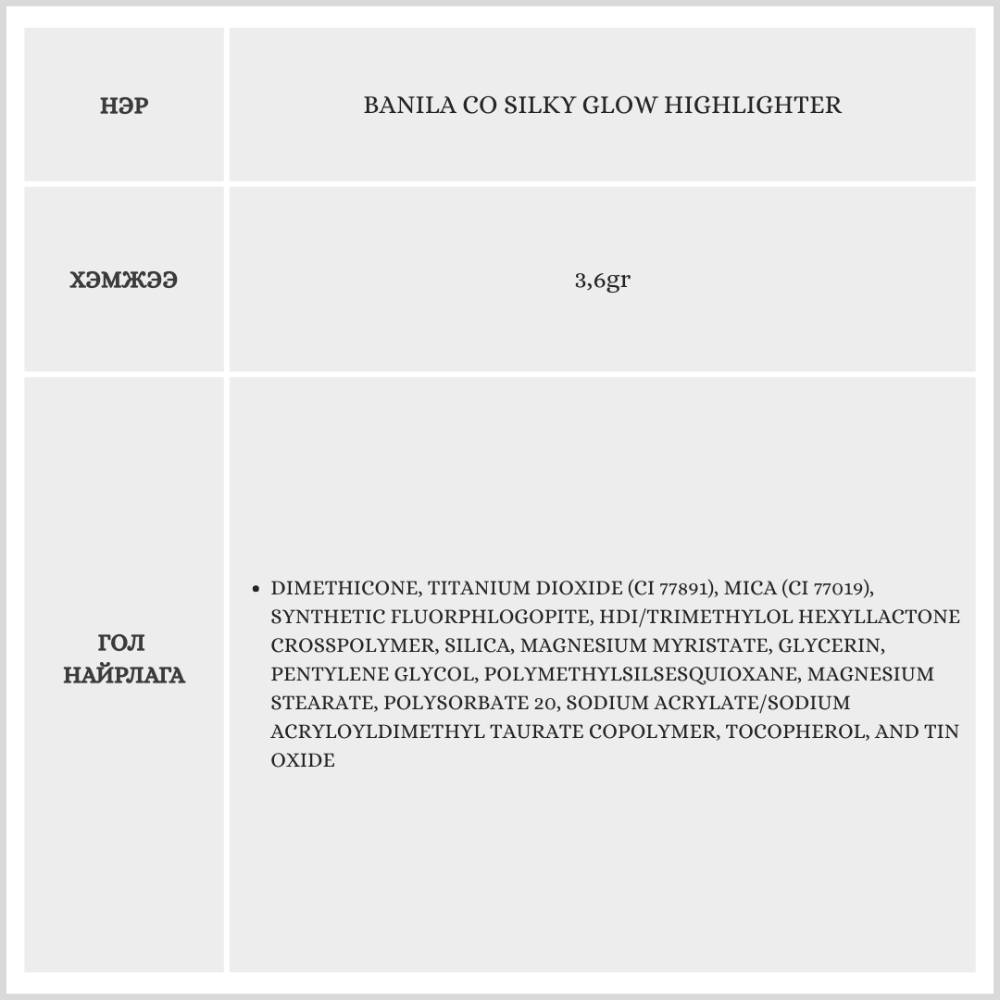 Banila Co Silky Glow Highlighter нь арьстай жигд уусч, хэт гялтгар биш цэвэр, байгалийн glow эффект үүсгэнэ. Шанаа, хамрын яс, хөмсөгний доод хэсэг, нүдний дотор буланд түрхэхэд нүүрийг илүү тод, зөв хэлбэртэй харагдуулна.
