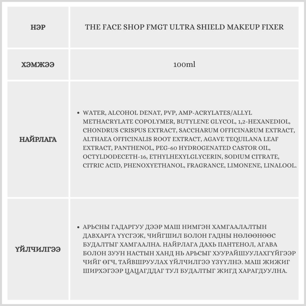 The Face Shop Fmgt Ultra Shield Makeup Fixer, 100ml /Будаг түгжигч/