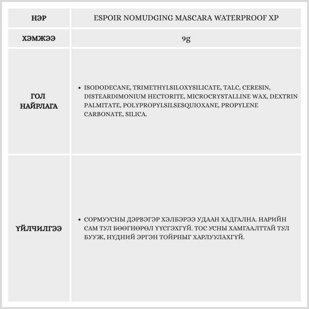 Ус, хөлс, тосонд тэсвэртэй найрлагатай сормуусны будаг бөгөөд өдрийн турш бууж хэлбэрээ алдахгүйгээрээ онцлог бүтээгдэхүүн юм.