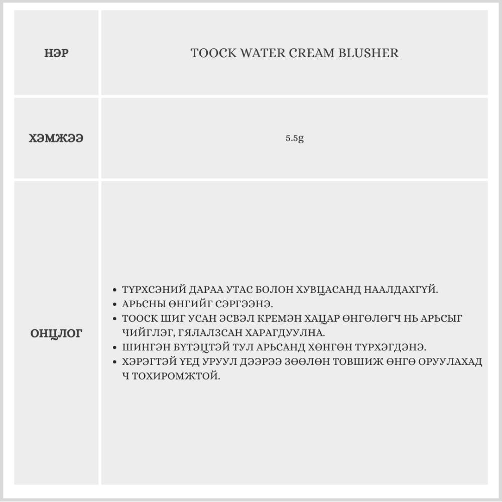 Энэхүү хацар өнгөлөгч нь ReCream буюу дахин дахин түрхэхэд зориулагдсан маш зөөлөн бүтэцтэйгээрээ онцлог.
