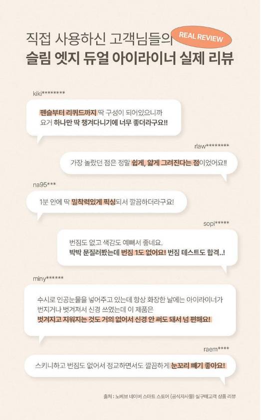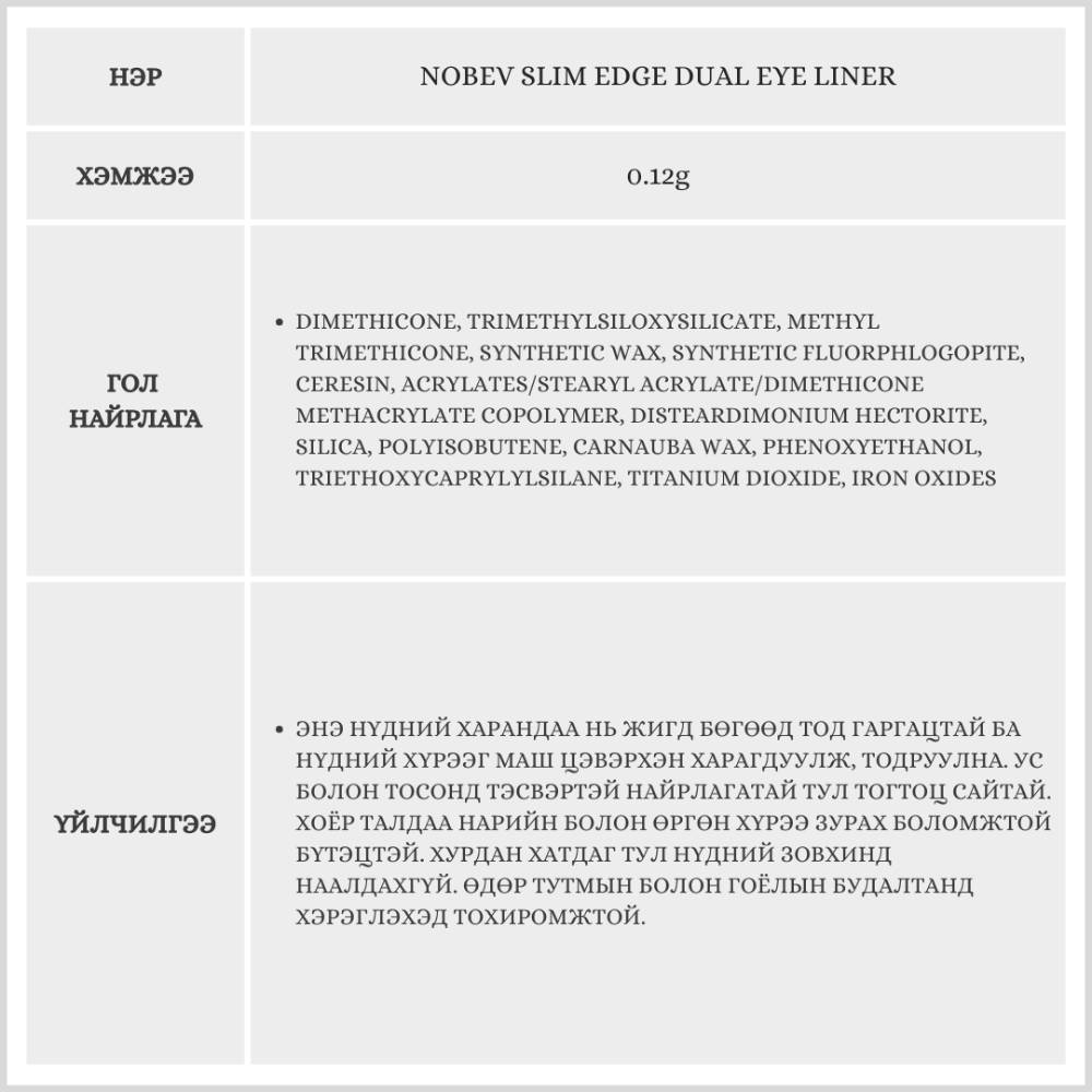 Энэхүү Nobev брэндийн нүдний харандаа нь нимгэн хошуутай бөгөөд нүдний хүрээг цэвэрхэн харагдуулах үйлчилгээтэй бүтээгдэхүүн юм. Нэг талдаа нарийн хүрээ гаргах нөгөө талдаа өргөн хүрээ гаргах боломжтой дуал бүтэцтэй. Тогтоц сайтай, будсаны дараа нүдийг илүү натурал харагдуулна.