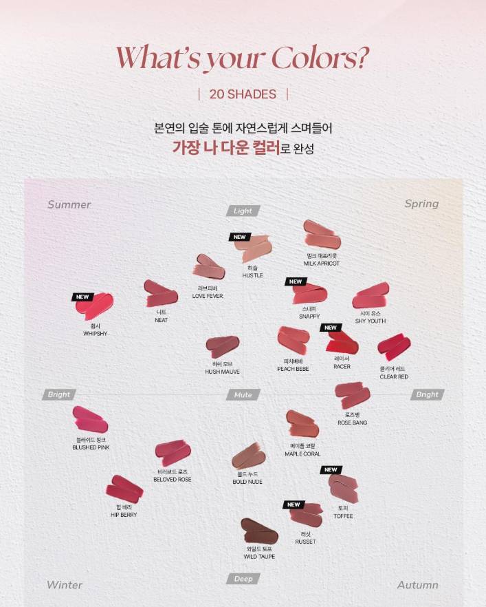 Энэхүү бүтээгдэхүүн нь матт бүтэцтэй боловч хуурайшуулахгүй, 20 өнгийн сонголттой, өдөр тутмын будалтанд тохиромжтой бөгөөд удаан тогтоцтой.