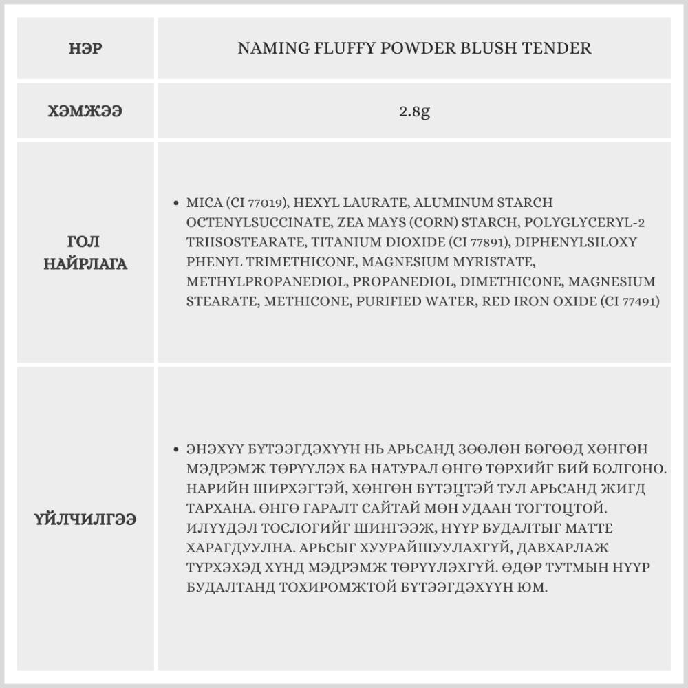 Naming Fluffy Powder Blush нь тогтоц сайтай, хөнгөн бүтэцтэй ба хацрыг өнгөлөг, гэгээлэг харагдуулах ба нүүрийг илүү натурал харагдуулна.