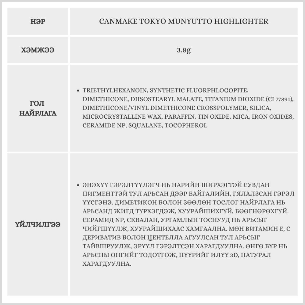 Canmake Tokyo брэндийн гэрэлтүүлэгч нь арьсанд жигд уусч, нүүрэнд байгалийн гэрэлтүүлэх effect үүсгэх үйлчилгээтэй бүтээгдэхүүн юм. Шанаа, хамрын яс, хөмсөгний доод хэсэг, нүдний дотор буланд түрхэхэд нүүрийг илүү тод, зөв хэлбэртэй харагдуулна. Хөнгөн, зөөлөн бүтэцтэй тул арьсыг хуурайшуулахгүй.