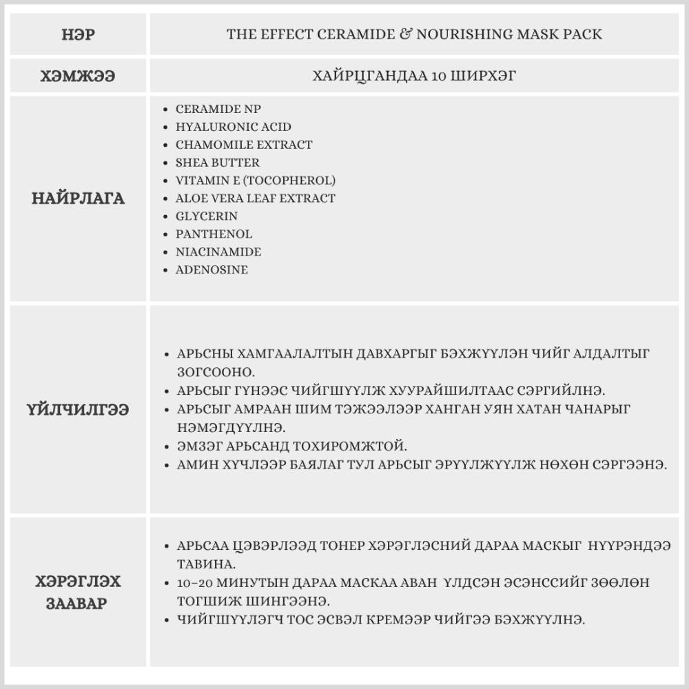 Арьсны хамгаалалтын давхаргыг бэхжүүлж, чийг алдалтыг багасгах үйлчилгээтэй маск. Арьсыг тэжээлээр ханган зөөлөн болгох ба арьсны уян хатан чанарыг нэмэгдүүлнэ.