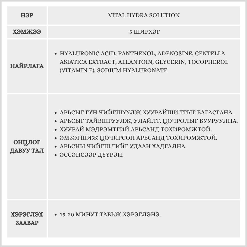 Найрлагадаа гиалоруны хүчил агуулсан арьсыг эрчимтэй гүн чийгшүүлэх үйлчилгээтэй эссэнцээр баялаг нүүрний маск.