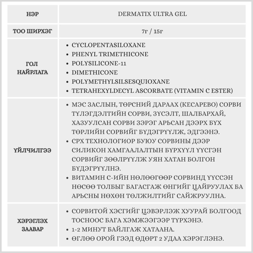 Dermatix Ultra Gel сорвины тос нь бүх төрлийн сорвийг зөөлрүүлэн эдгээж бүдэгрүүлэх ба витамин С найрлагадаа агуулсан тул сорвины нөсөө толбыг арилгаж арьсыг цайруулна.