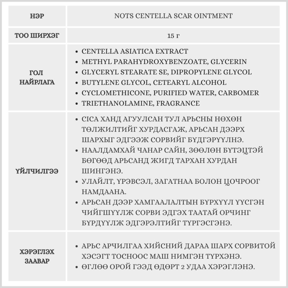 NOTS брэндийн Centella Scar Ointment сорвины тос нь арьсны гэмтэл, сорви, улайлт, эмзэгшлийг тайвшруулах зориулалттай эмчилгээний тосон түрхлэг юм. Гол найрлага болох центелла нь арьсыг нөхөн төлжүүлж тайвшруулах бол илланг-илланг үнэрт тос нь арьсны тэнцвэрийг хадгалж анхилуун үнэр ялгаруулна.