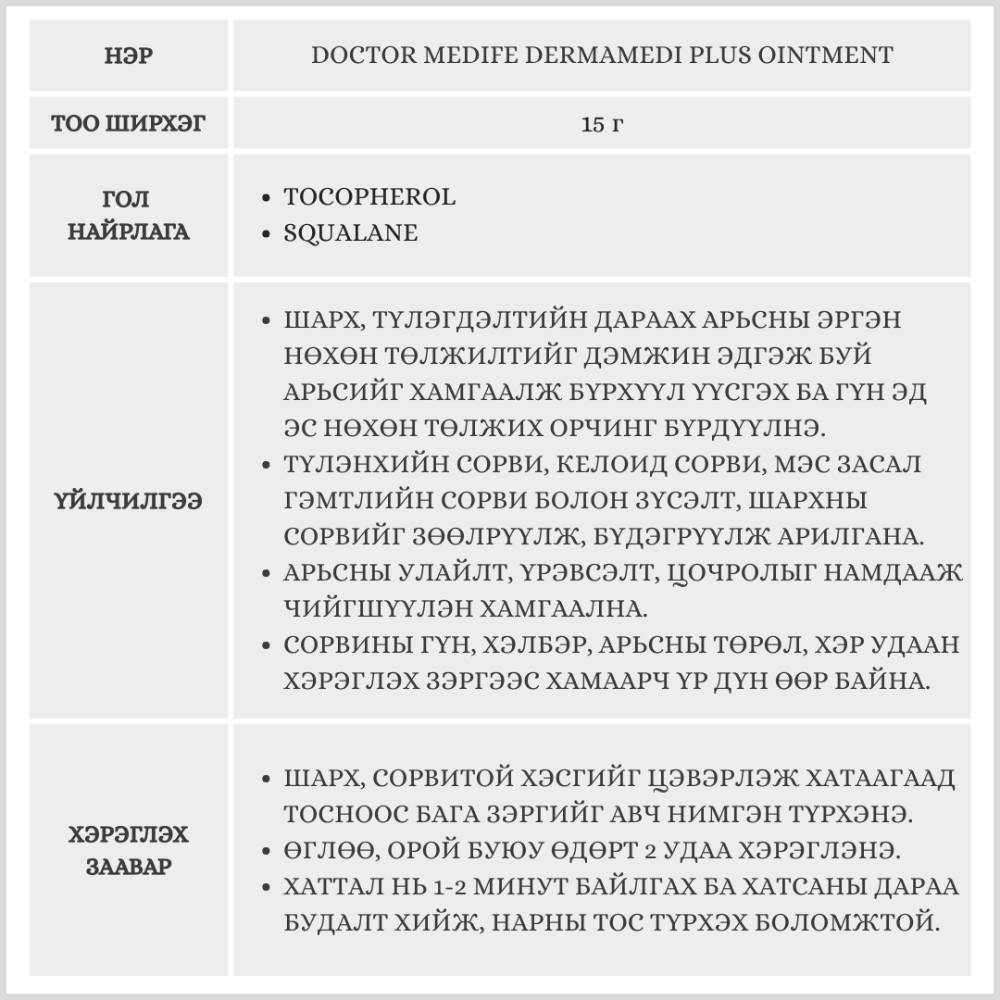 Мэс засал, түлэгдэлт, гэмтлийн дараах сорви болон шархны эдгэрэлтийг дэмжих зориулалттай гель. Витамин E болон Сквалан агуулдаг тул арьсыг тайвшруулж, чийгшүүлэн хамгаалах ба сорвийг зөөлрүүлж бүдгэрүүлнэ. Эмзэг арьсанд тохиромжтой бөгөөд хурдан шингэж арьсыг цочроохгүй.