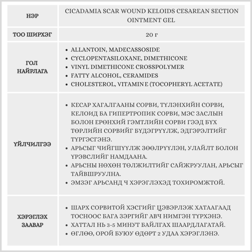 Кесар хагалгааны сорви, түлэнхийн сорви, келоид ба гипертропик сорви, мэс заслын болон ерөнхий гэмтлийн сорви гээд бүх төрлийн сорвийг бүдэгрүүлж, эдгэрэлтийг түргэсгэх үйлчилгээтэй гелэн түрхлэг. Эмзэг арьсанд ч хэрэглэх боломжтой.