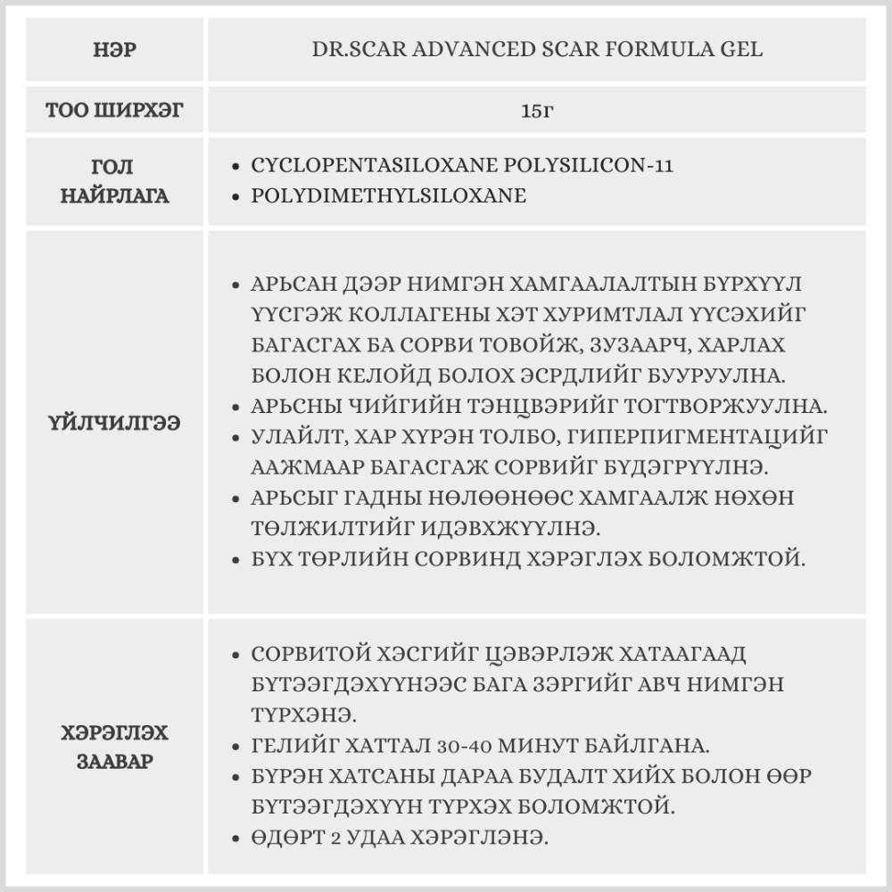 Dr.Scar сорвины гель нь арьсан дээр хамгаалалтын нимгэн бүрхүүл үүсгэж арьсны нөхөн төлжилтийг дэмжих замаар бүх төрлийн сорвийг эдгээж бүдэгрүүлэх үйлчилгээтэй эмчилгээний бүтээгдэхүүн юм.
