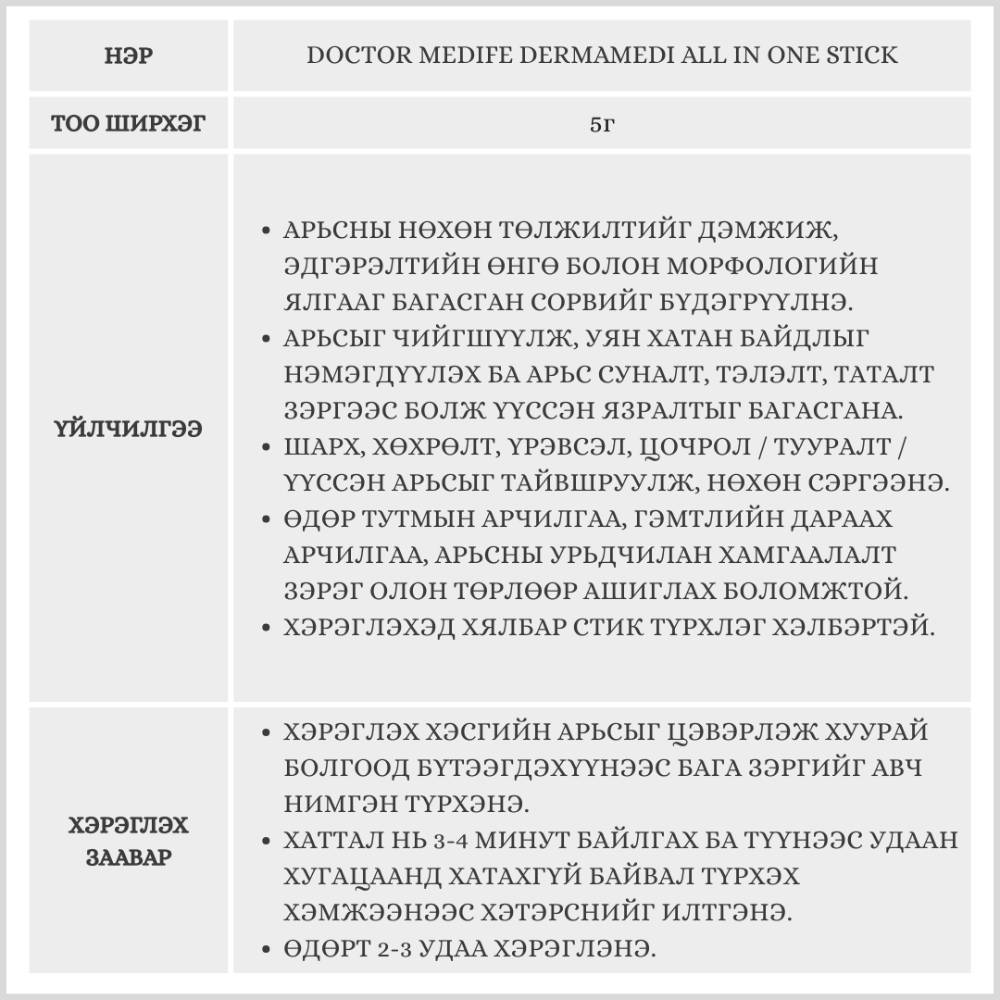 Doctor medife Dermamedi стик нь дан ганц сорвийг эдгээж арилгаад зогсохгүй арьсны язралт, хөхрөлт болон загатнааг багасгаж арилгах олон үйлчилгээг нэг дор багтаасан эмчилгээний түрхлэг юм.