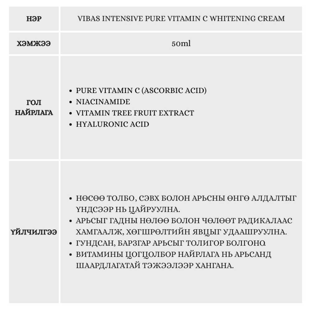 Энэхүү тос нь арьсны өнгийг сэргээх Vitamin С-ээр баяжуулсан тул арьсны гүн дэх меланин пигментийг задлах замаар сэвх, нөсөө толбо болон батганы дараах сорвийг цайруулж, арьсны өнгийг жигдрүүлнэ.